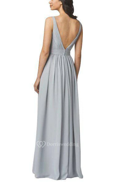 V-neck Strapped Ruched Long Bridesmaid Dress