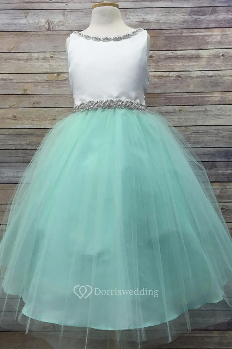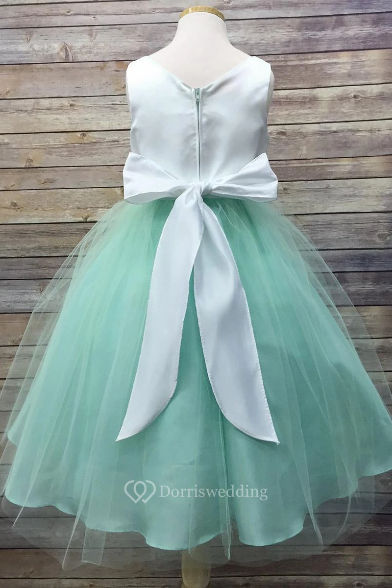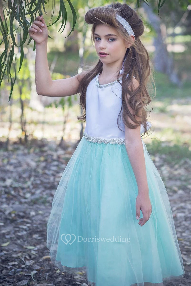 V-Neck Tea-Length Beaded Tulle&Satin Flower Girl Dress