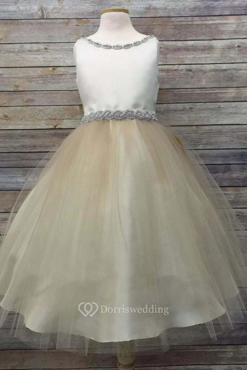 V-Neck Tea-Length Beaded Tulle&Satin Flower Girl Dress