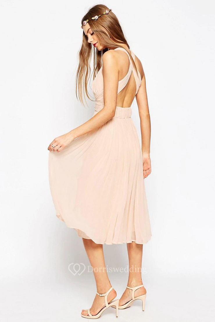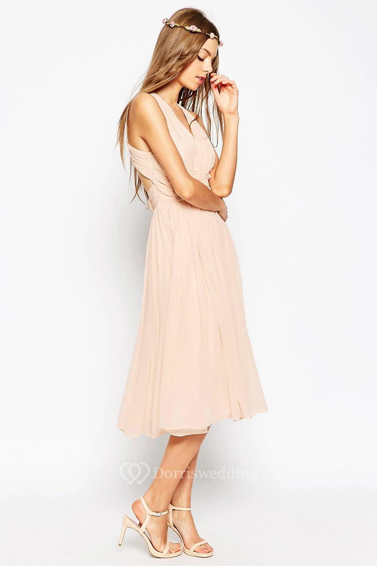 V-Neck Tea-Length Pleated Sleeveless Chiffon Bridesmaid Dress With Ruching And Straps