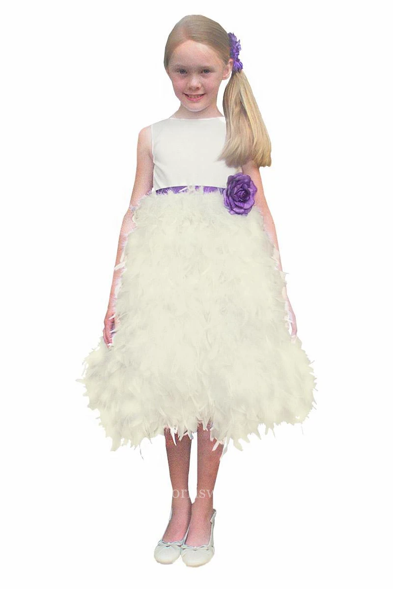 V-Neck Tea-Length Sleeveless Satin Flower Girl Dress
