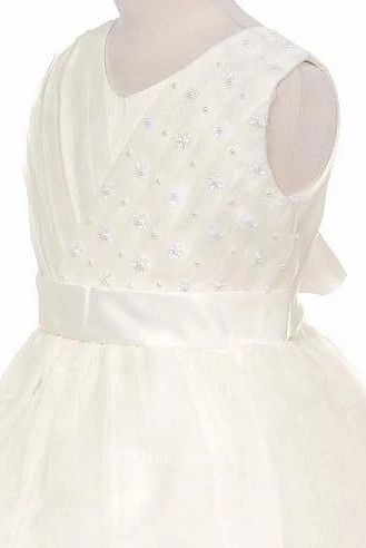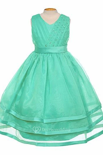 V-Neck Tea-Length Tiered Pleated Organza&Satin Flower Girl Dress With Sash