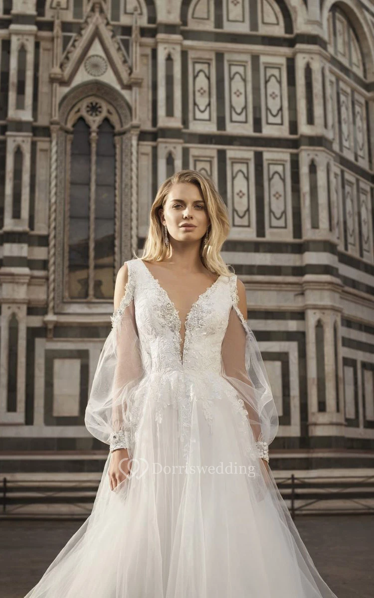 V-neck Tulle Puff-sleeve Ethereal A-line Ball Gown Beaded Wedding Dress with Low-v Back