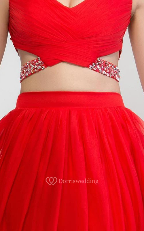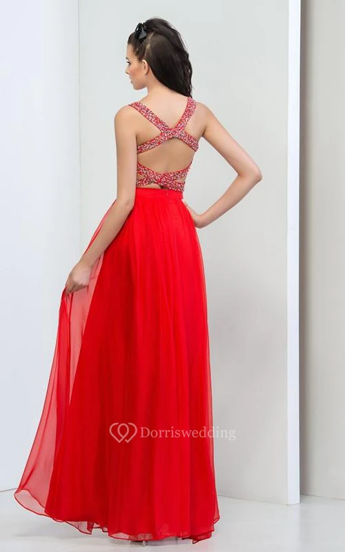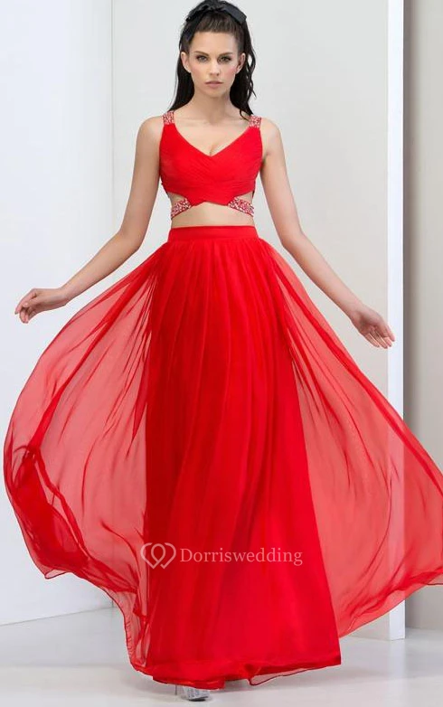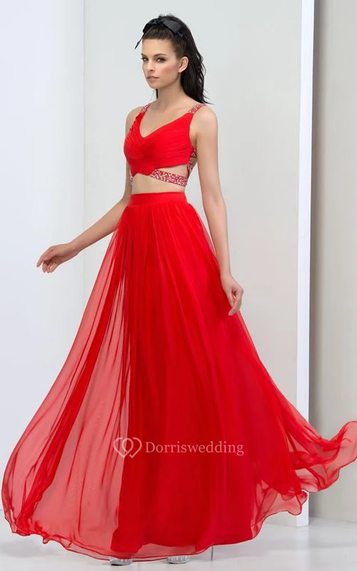 V-Neck Two-Piece Criss-Cross Sequins Prom Dress
