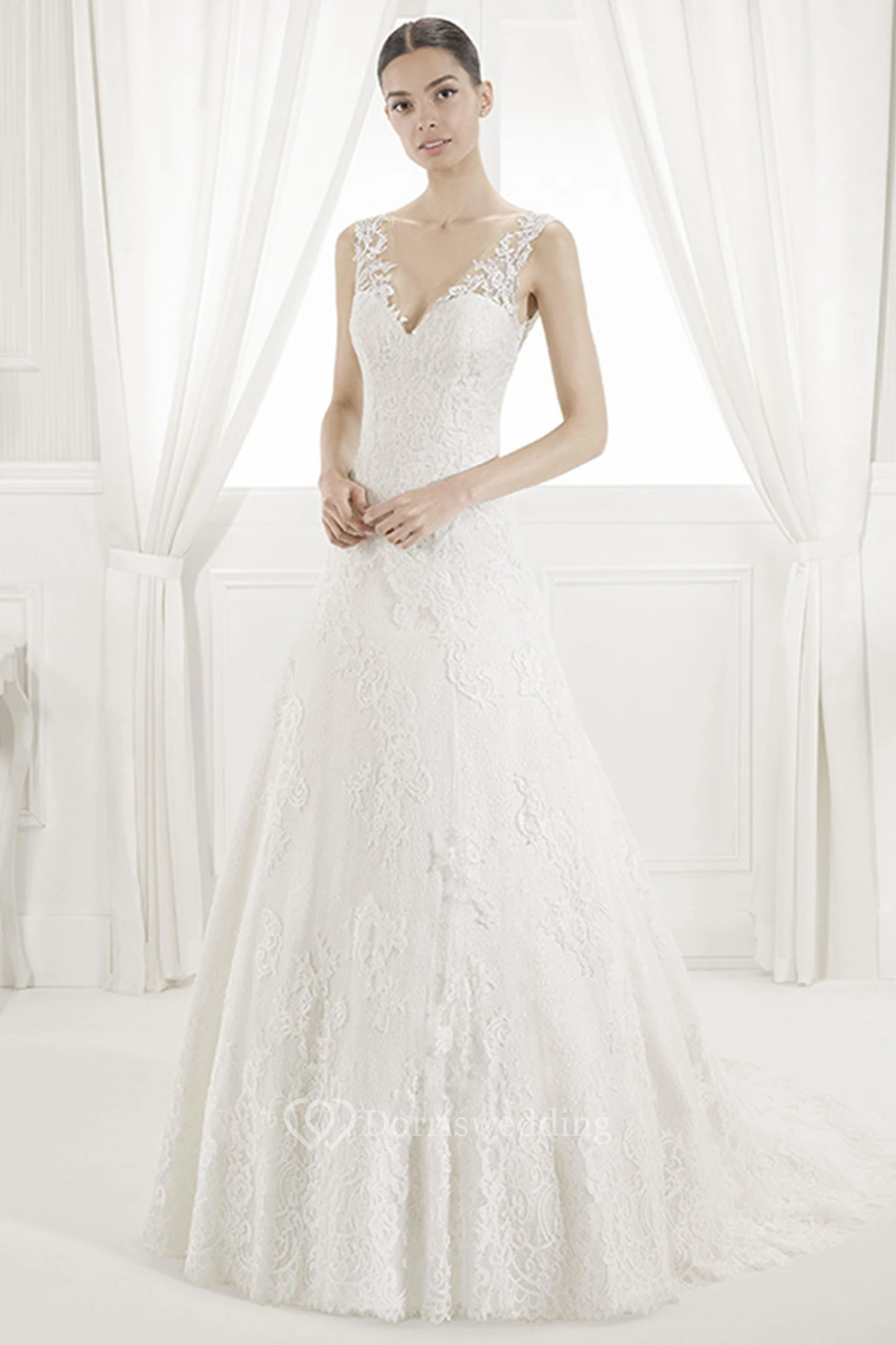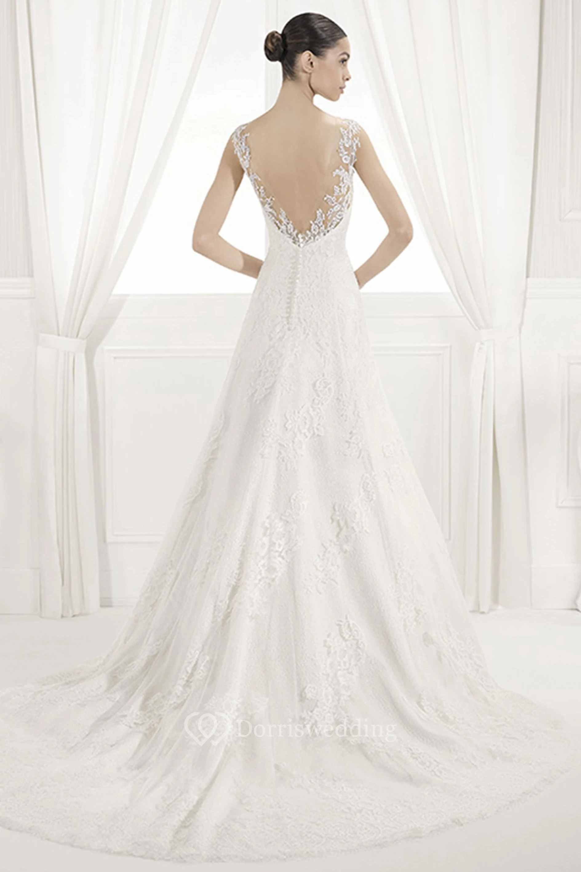 V Neck V Back A-Line Lace Bridal Gown With Illusion Style