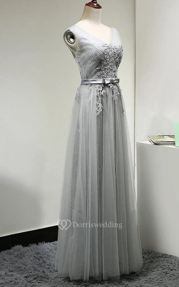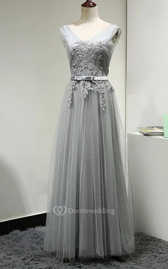 V Neck V Back Cap Sleeve A-line Pleated Tulle Long Dress With Applique and Belt