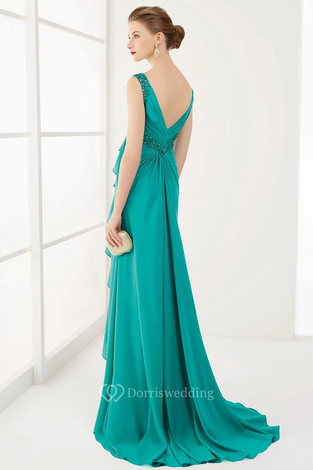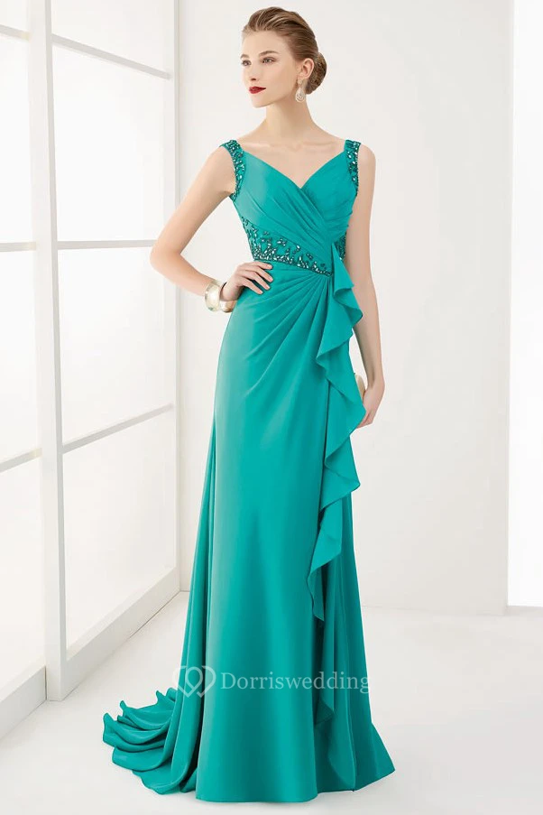 V Neck V Back Crystal Waist Long Prom Dress With Ruffles And Brush Train