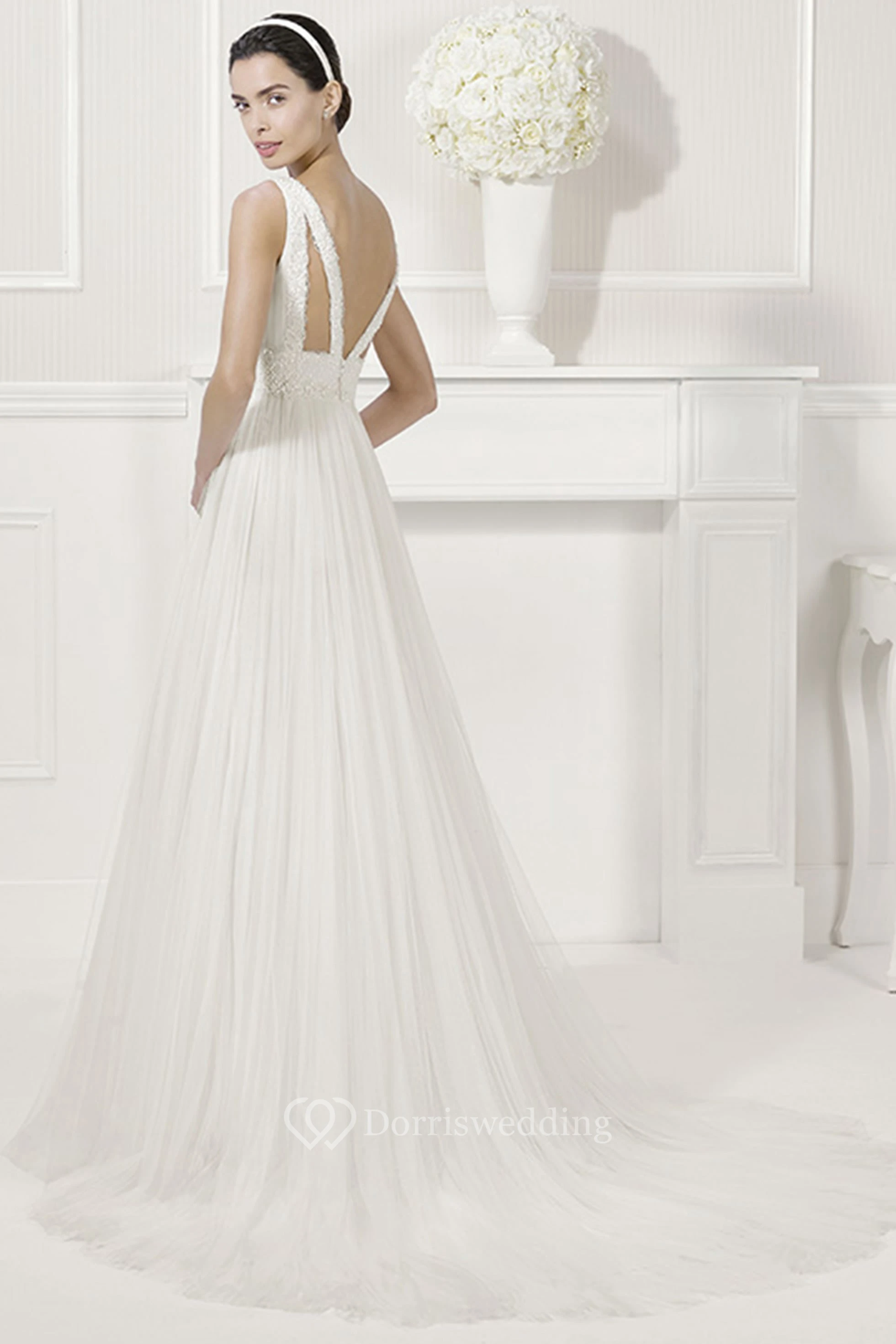 V Neck V Back Emprie Pleated A-Line Tulle Bridal Gown With Jewels