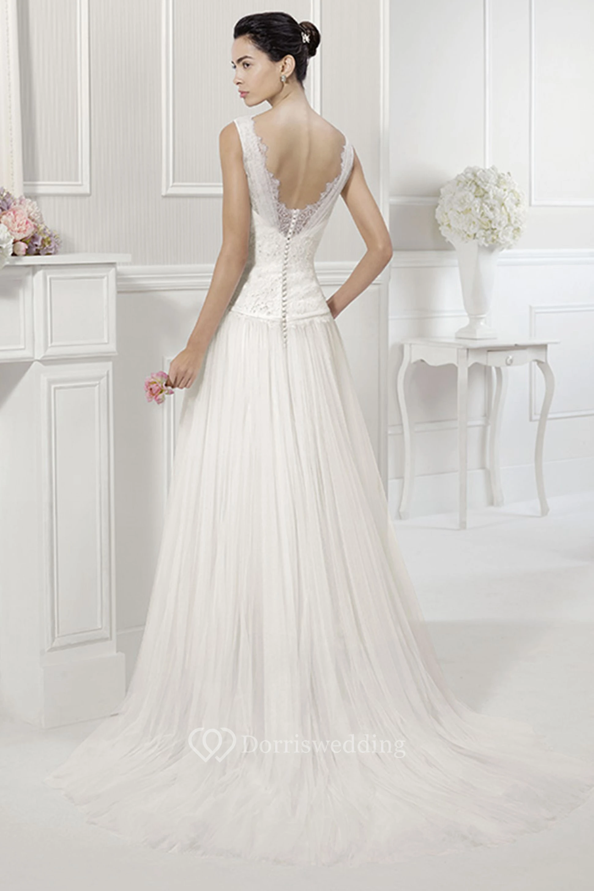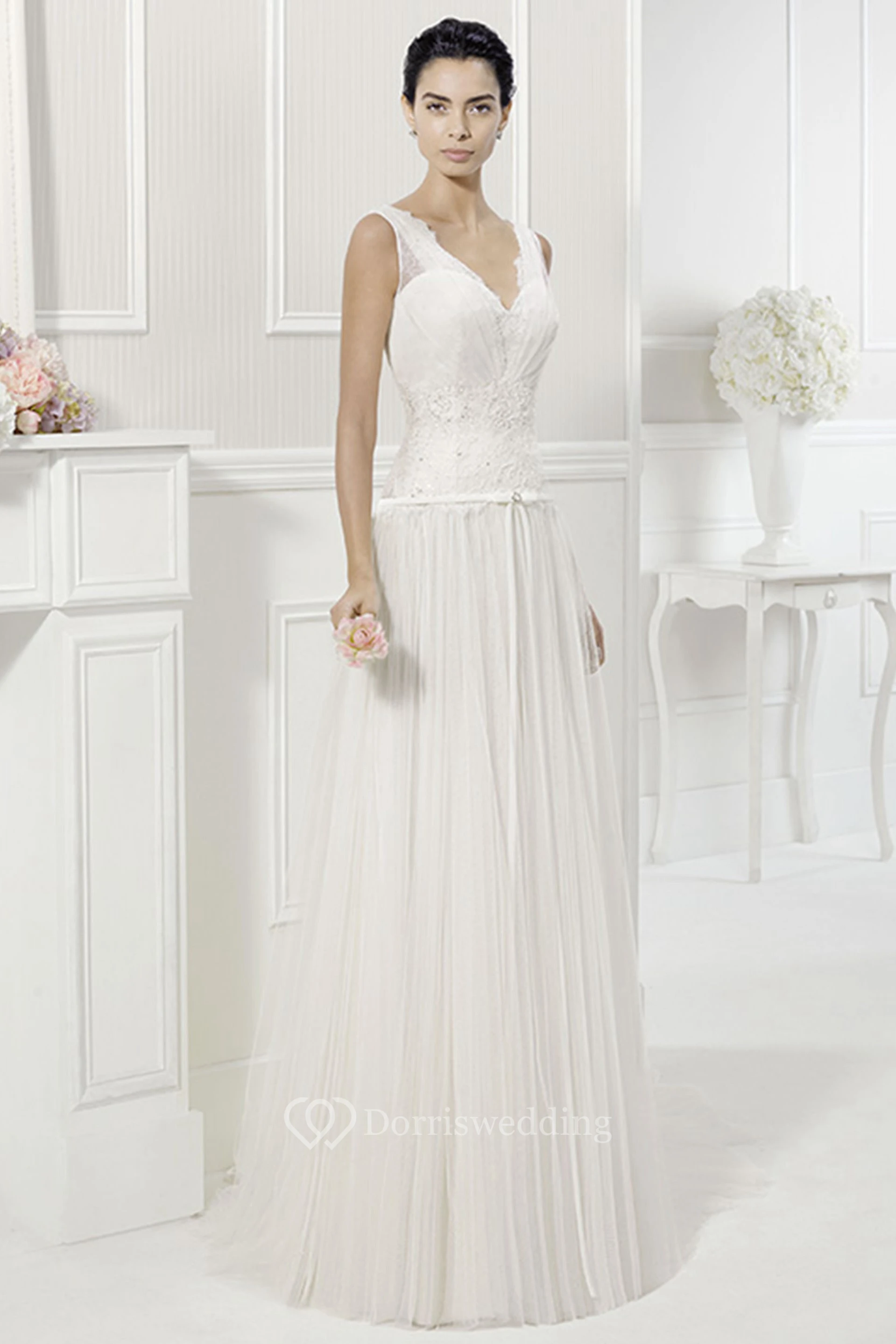 V Neck V Back Lace Drop Waist Tulle Bridal Gown With Belt