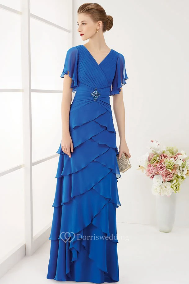 V Neck V Back Layered Chiffon Long Prom Dress With Ruffled Short Sleeves