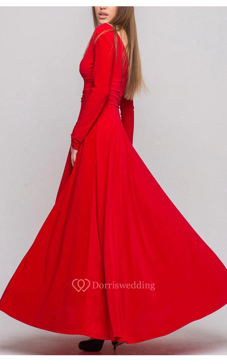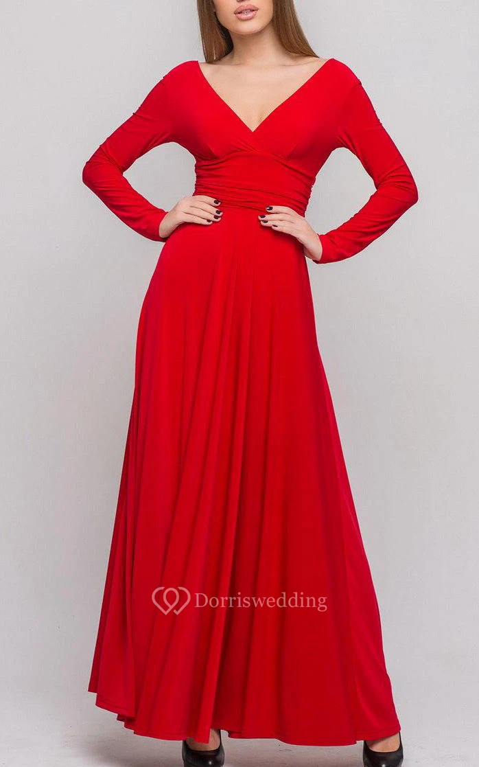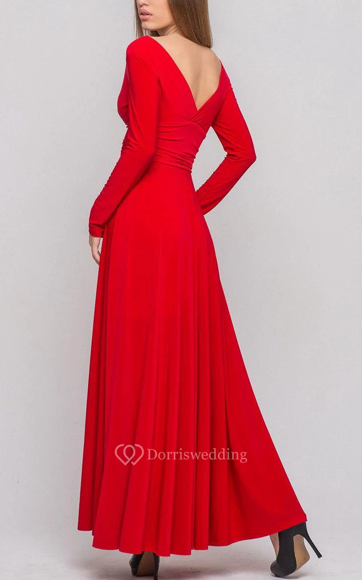 V Neck V Back Long Sleeve A-line Pleated Jersey Long Dress