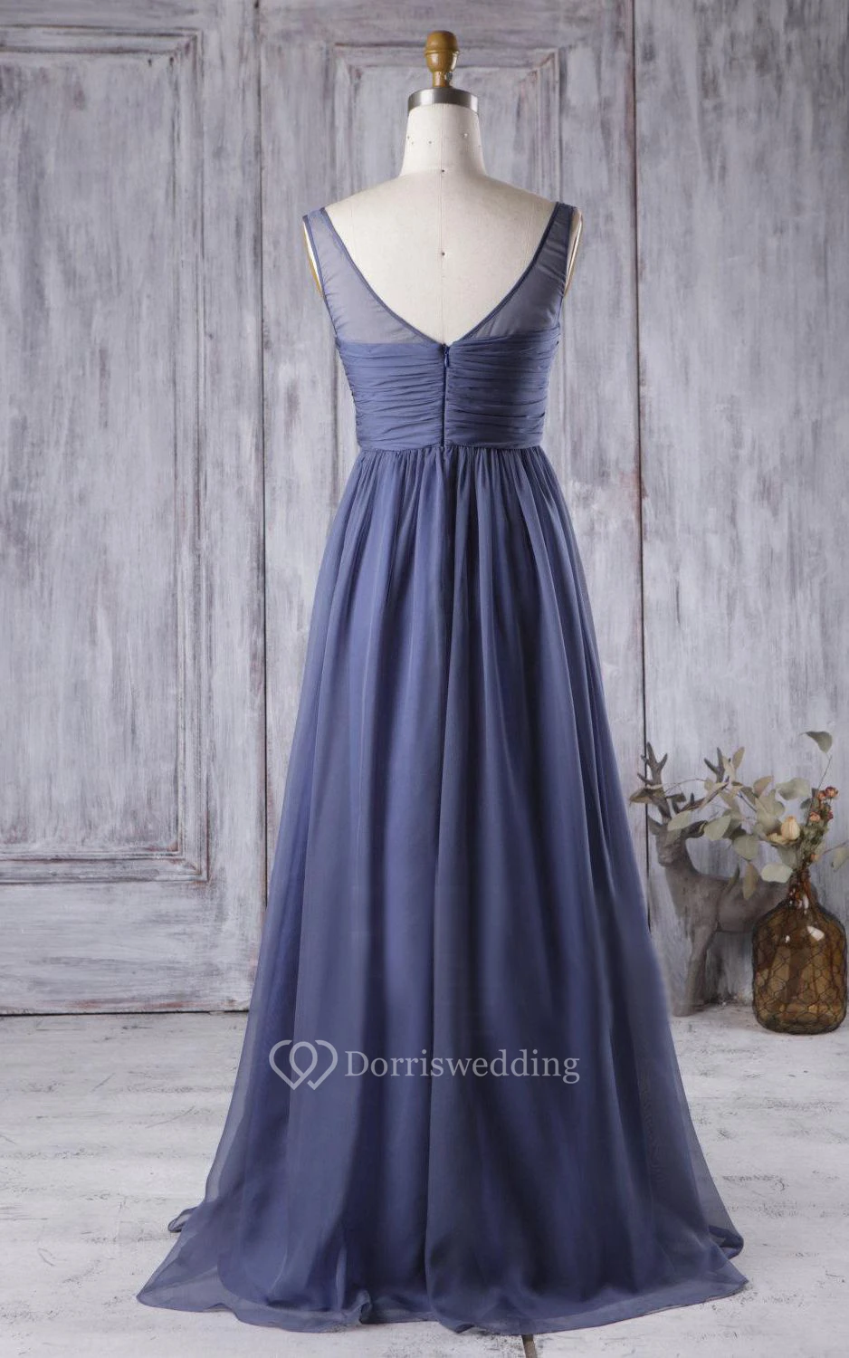 V Neck V Back Pleated A-line Chiffon Long Dress Brush Train