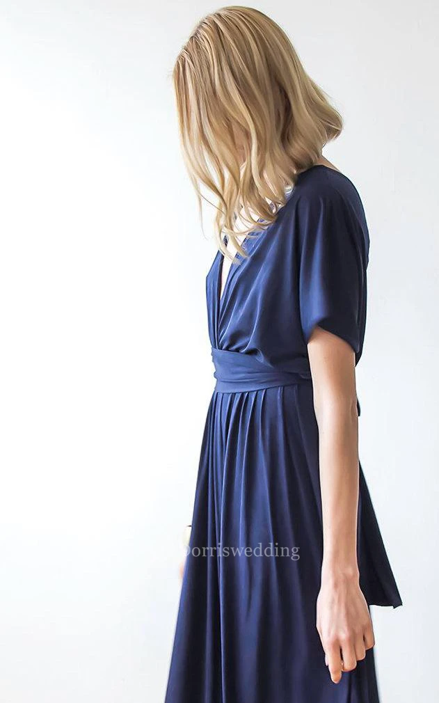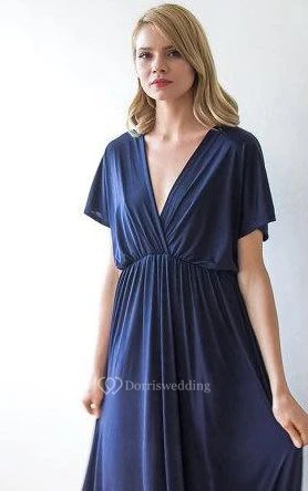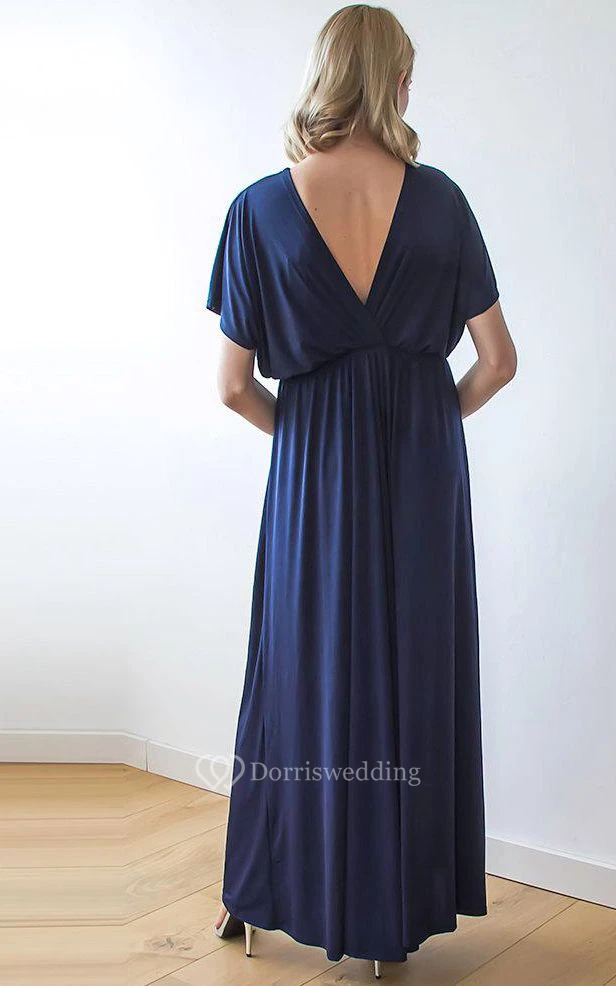 V Neck V Back Short Sleeve Pleated A-line Jersey Floor Length Dress