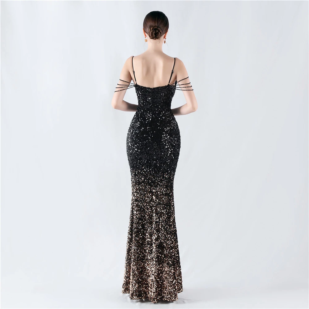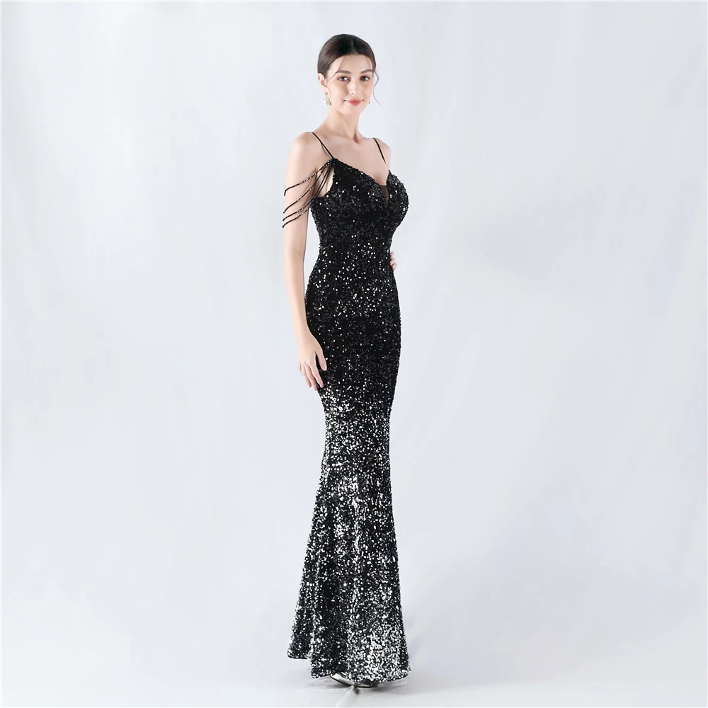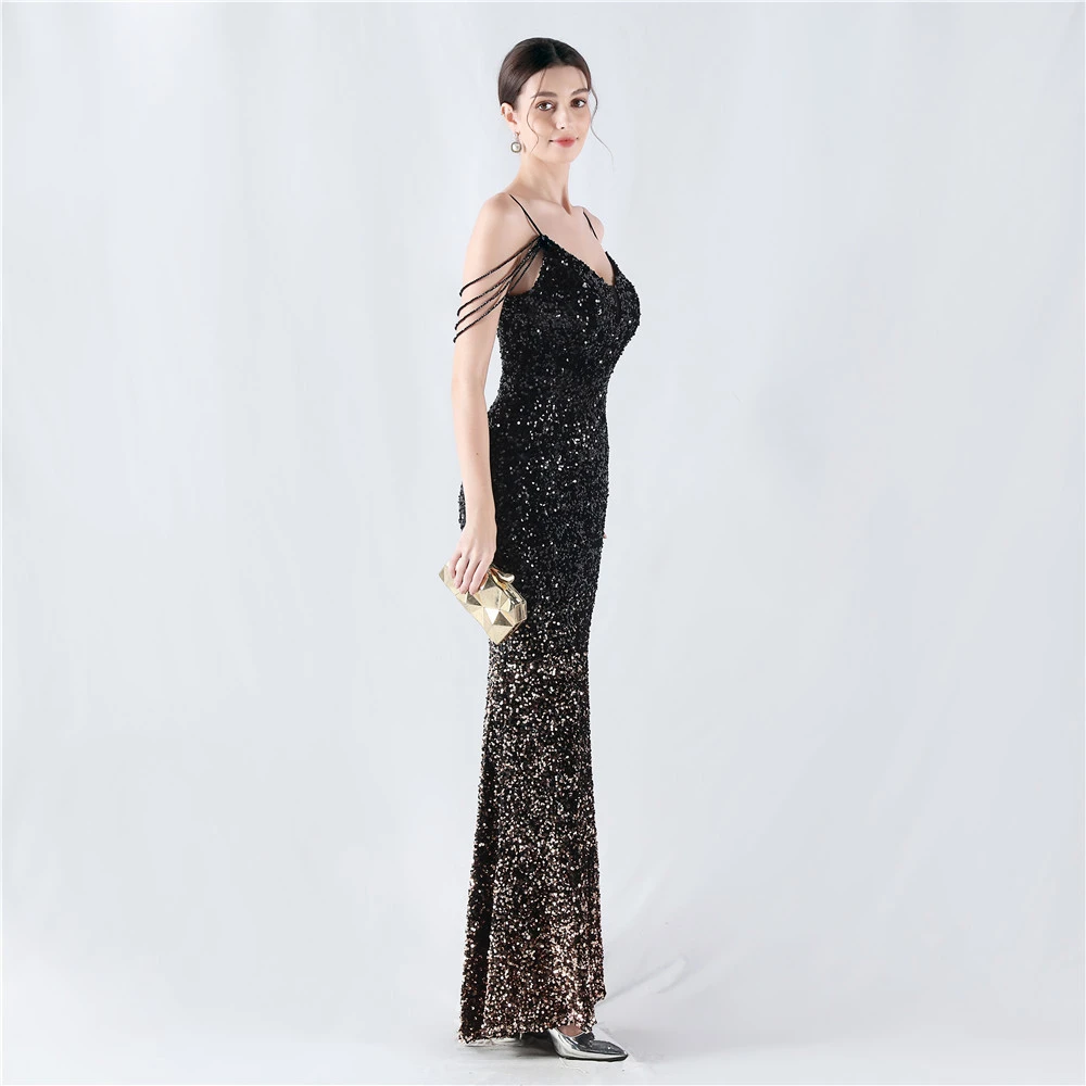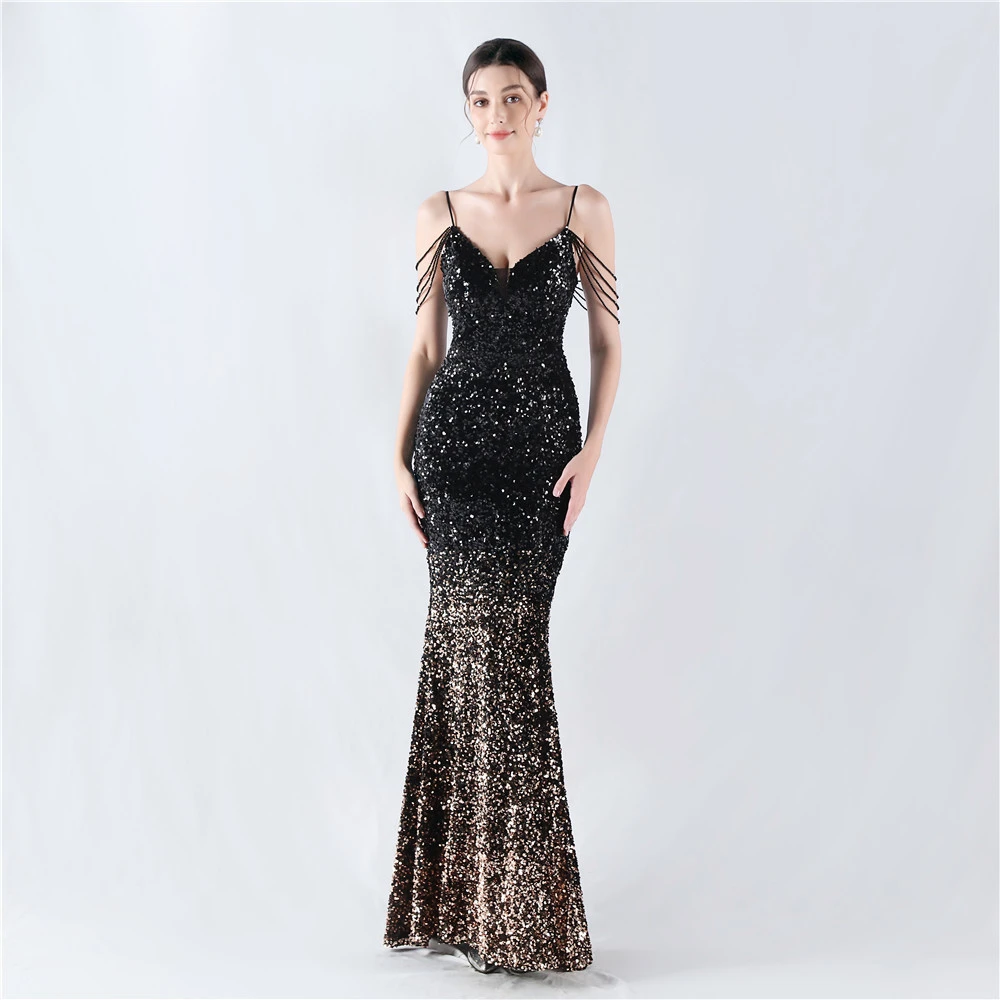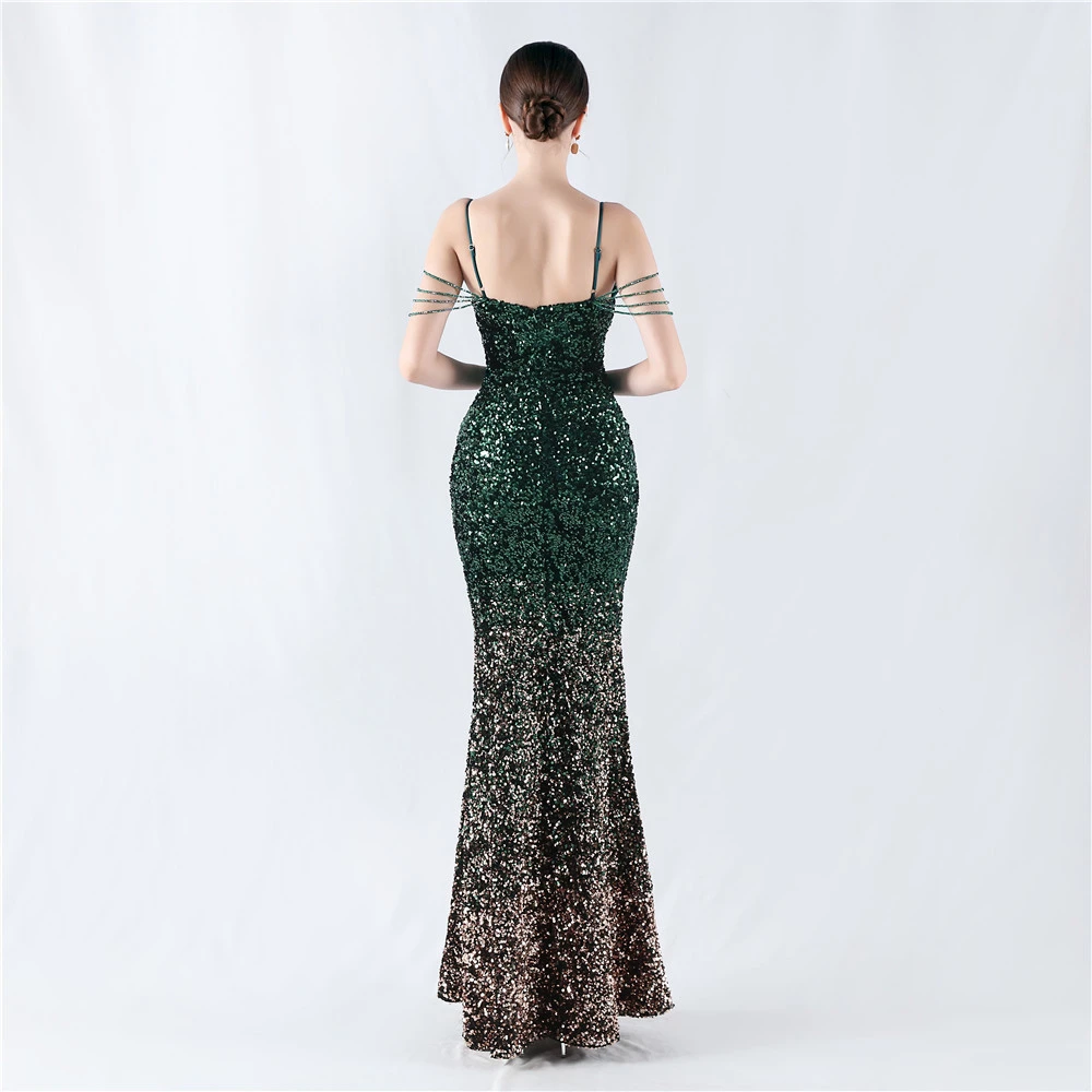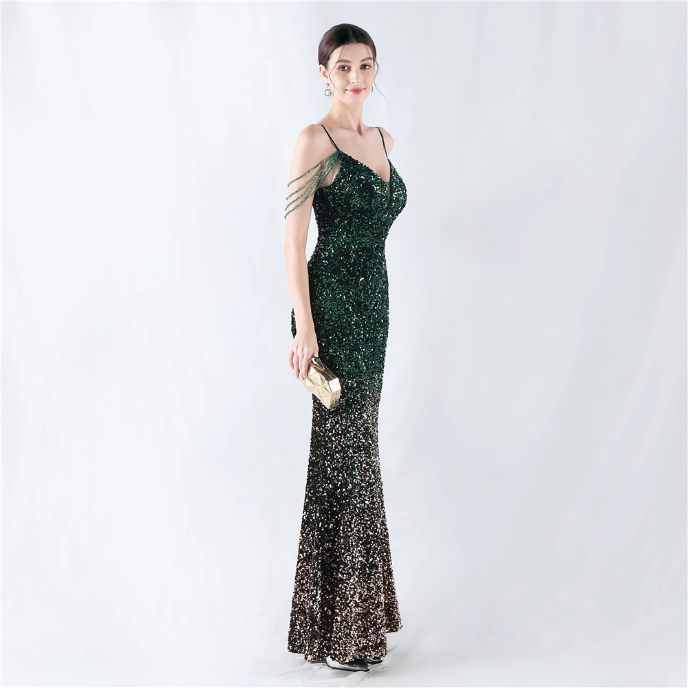 Velvet-Bottom Gradient Sequined Sexy Beaded Suspender Evening Dress
