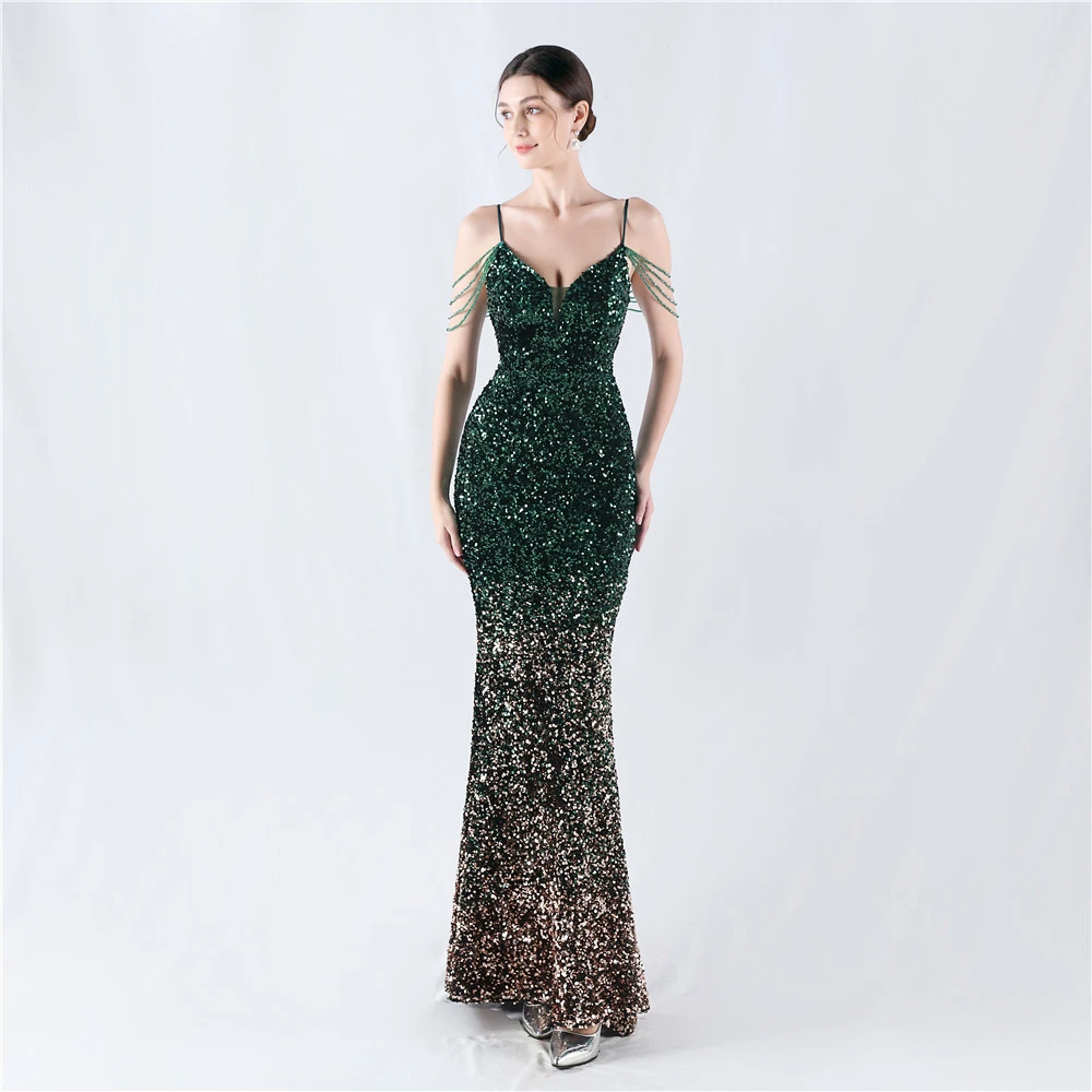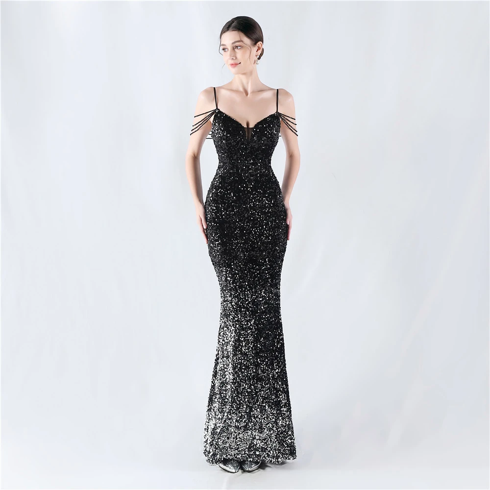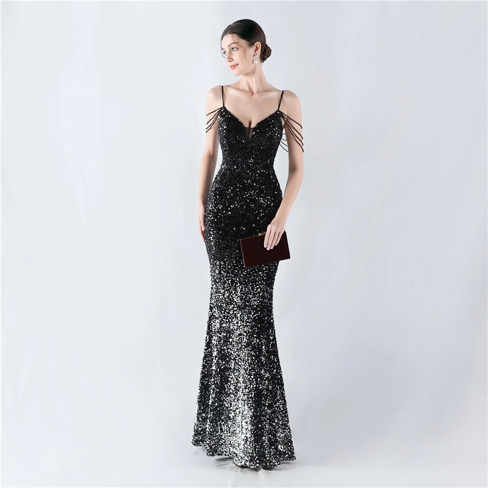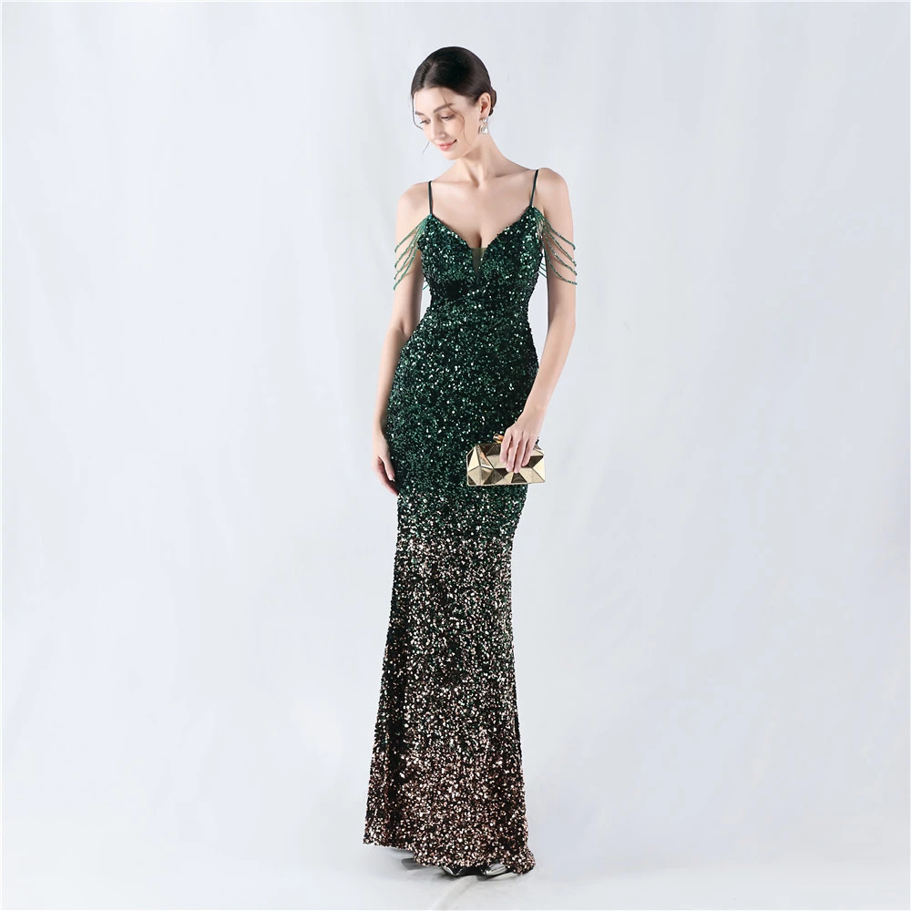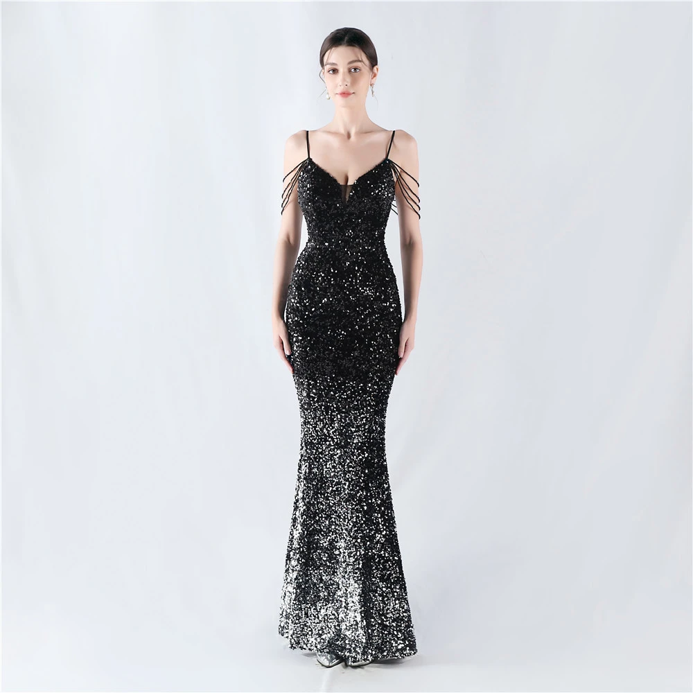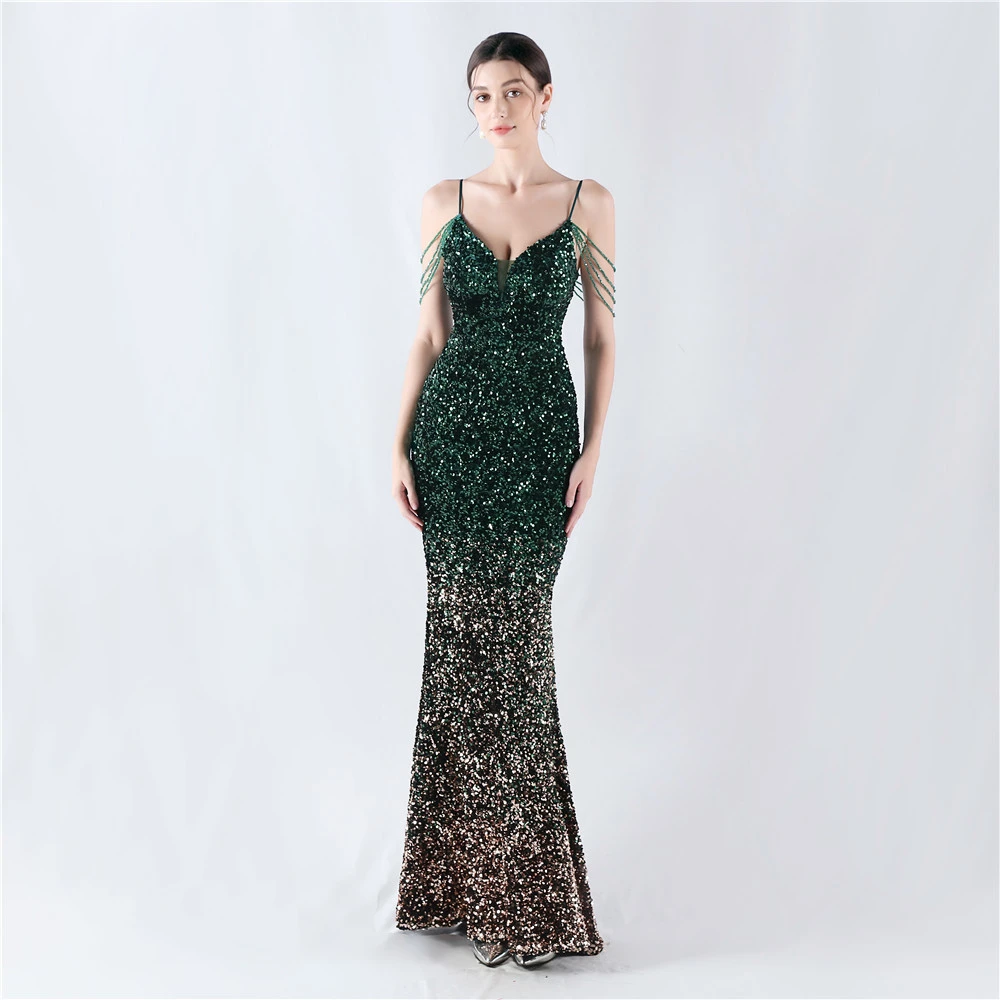 Velvet-Bottom Gradient Sequined Sexy Beaded Suspender Evening Dress