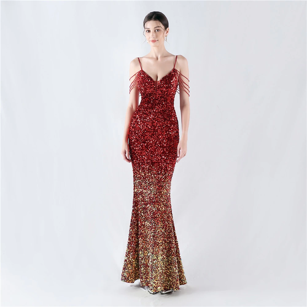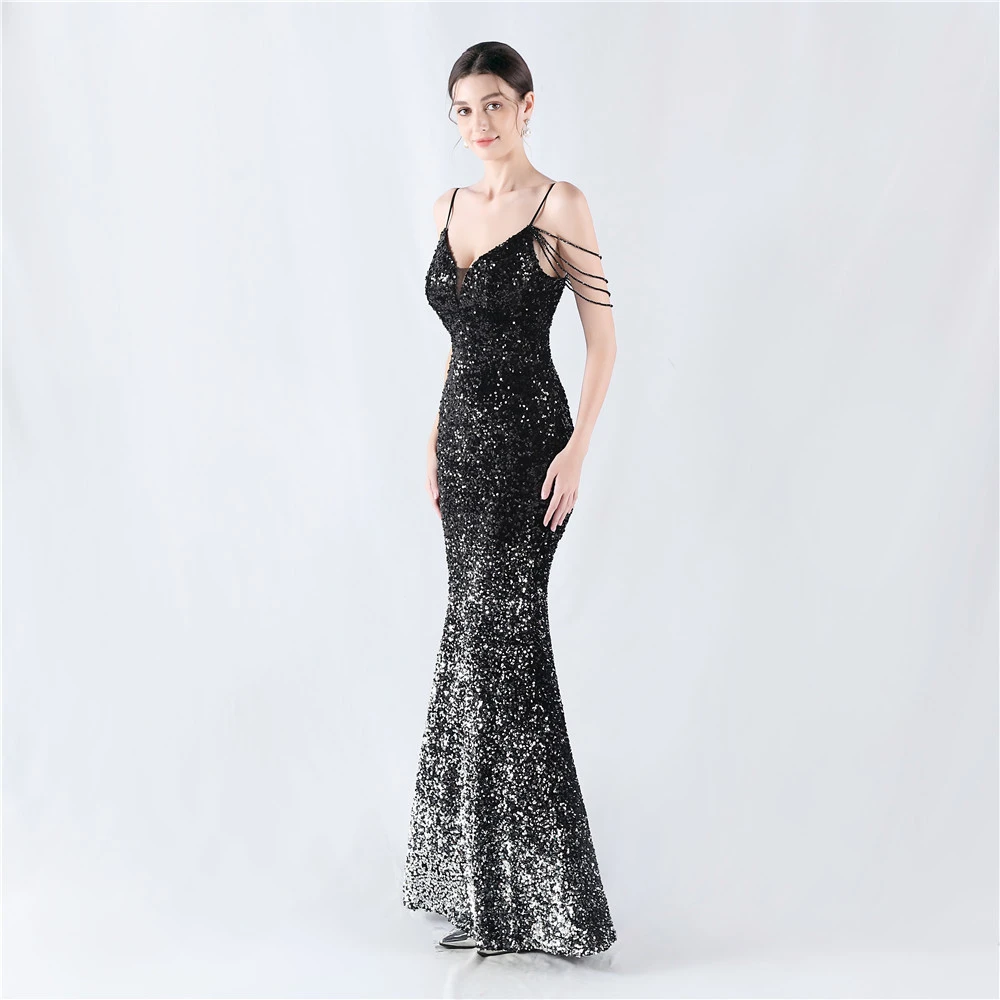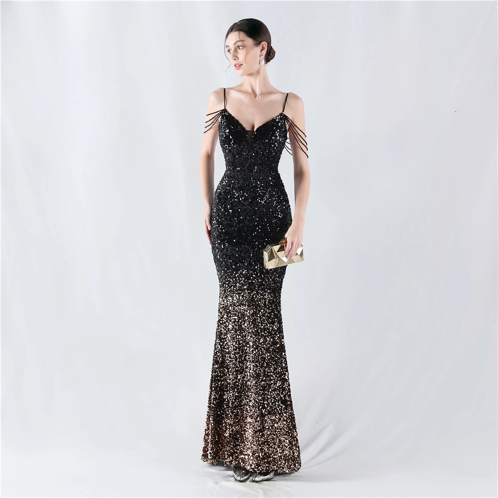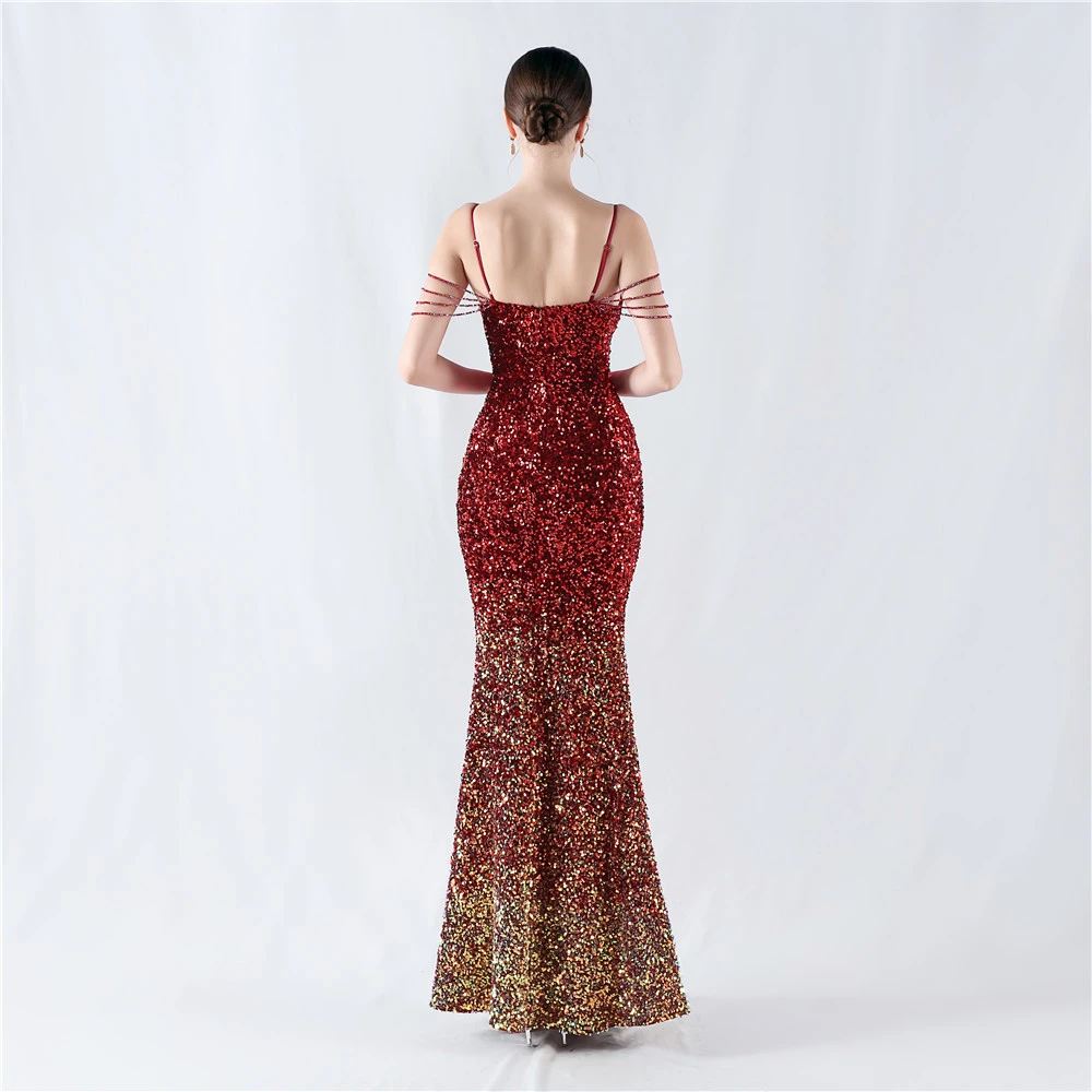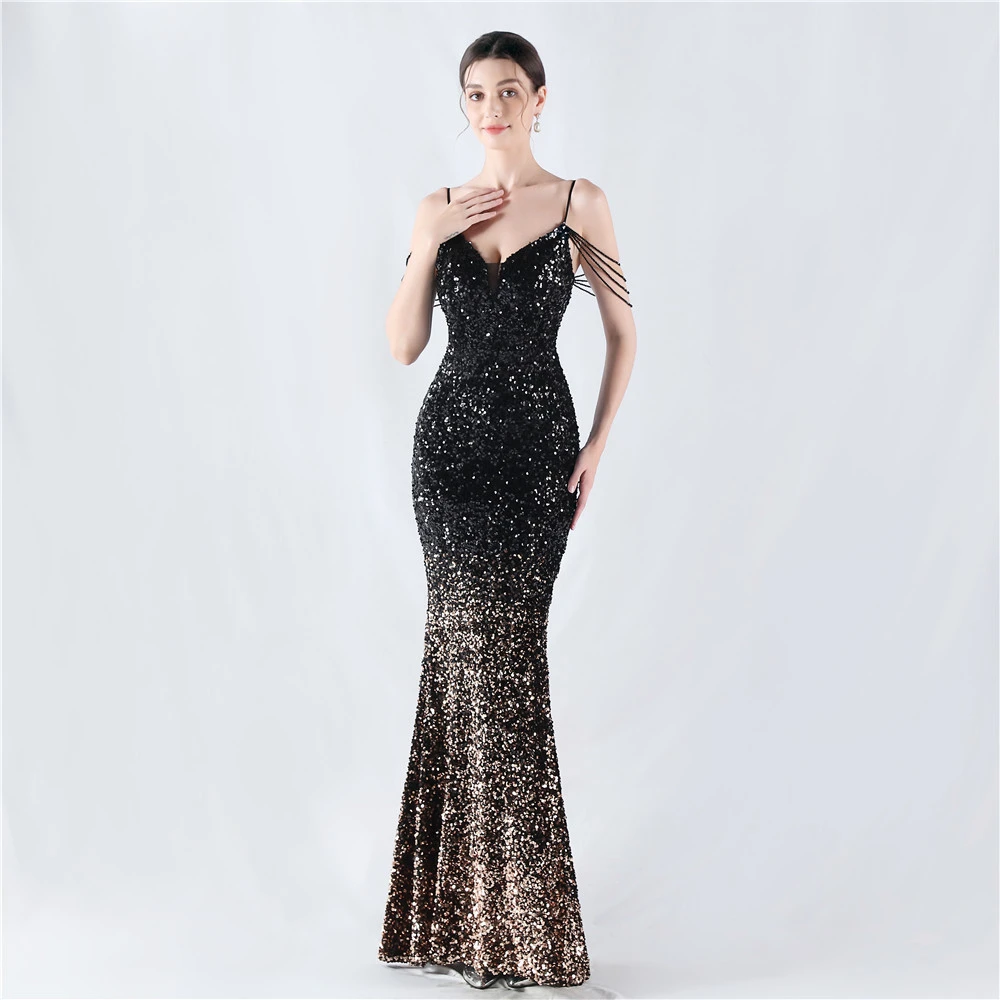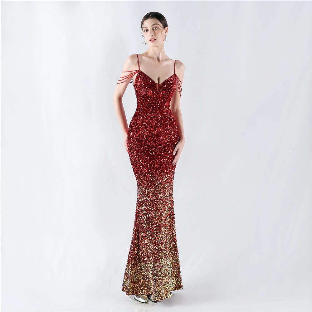 Velvet-Bottom Gradient Sequined Sexy Beaded Suspender Evening Dress