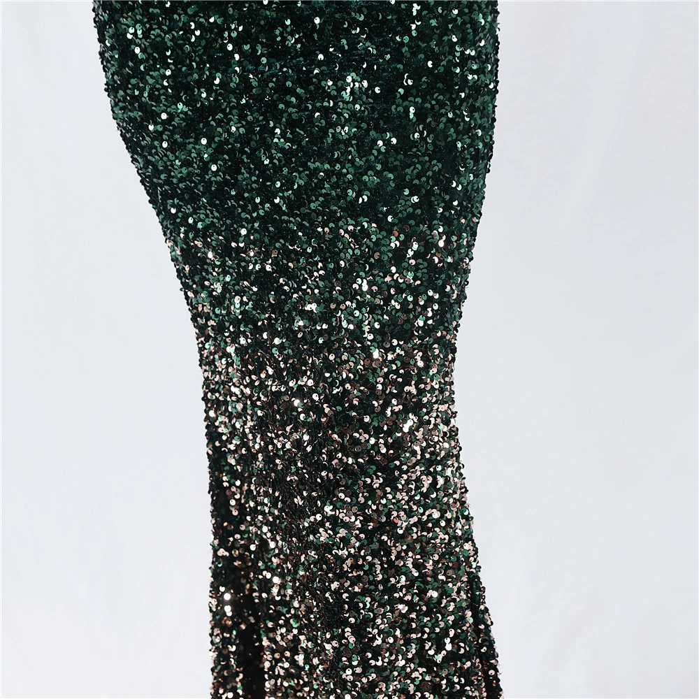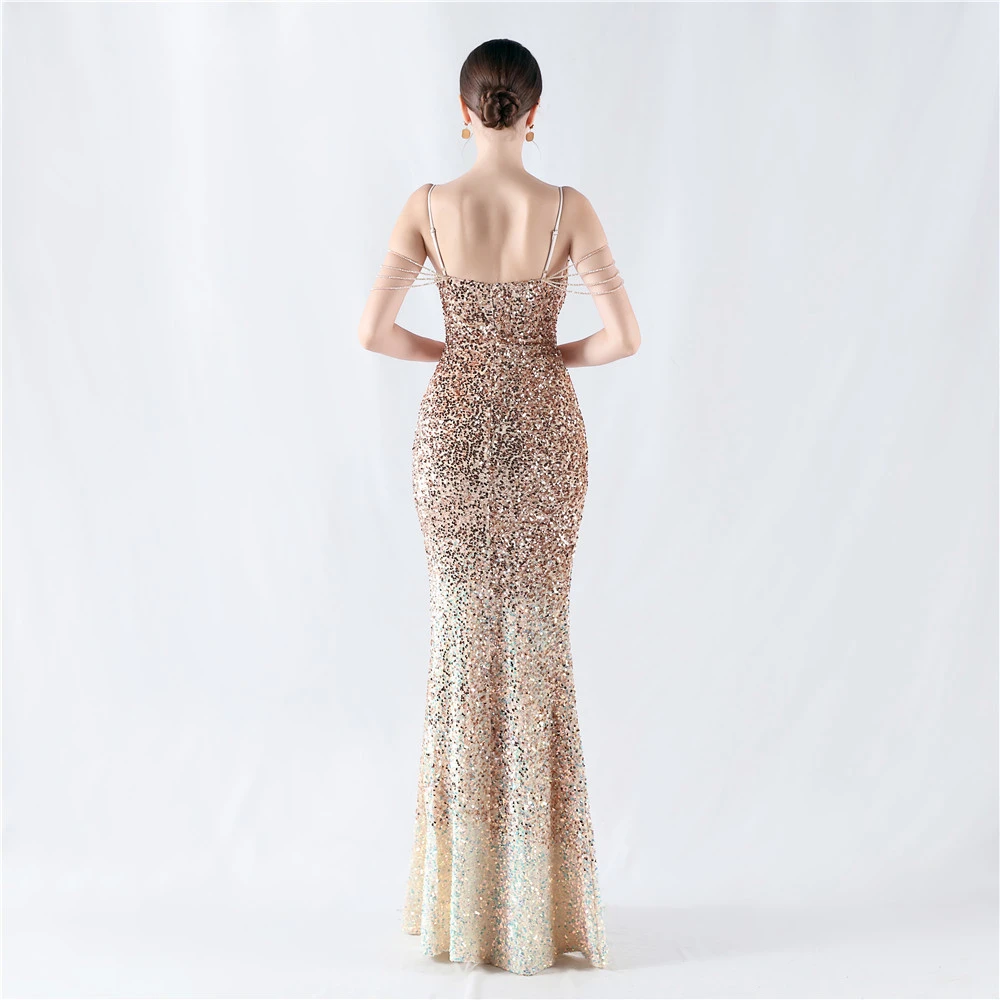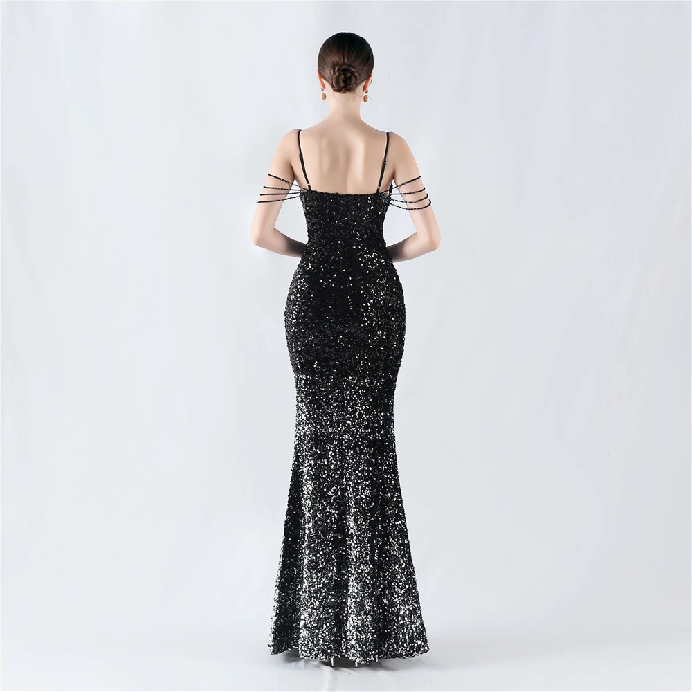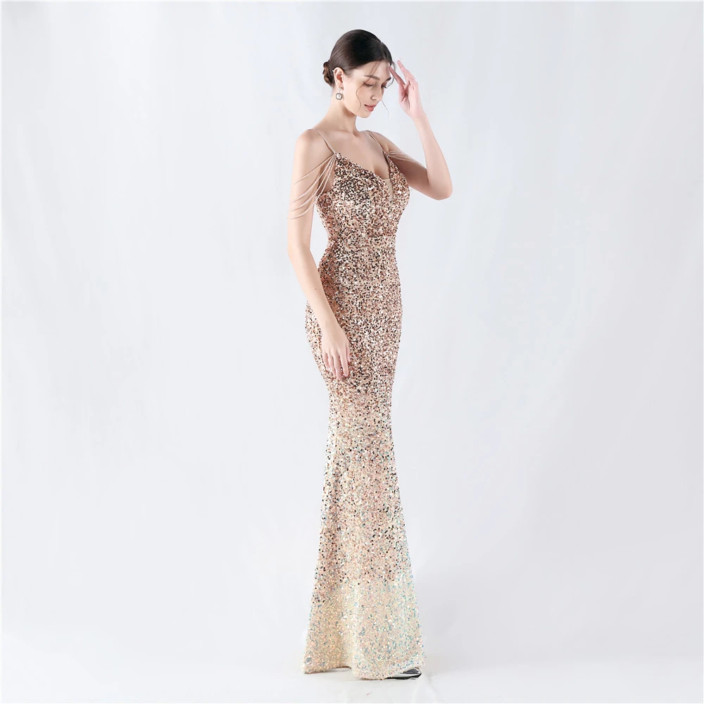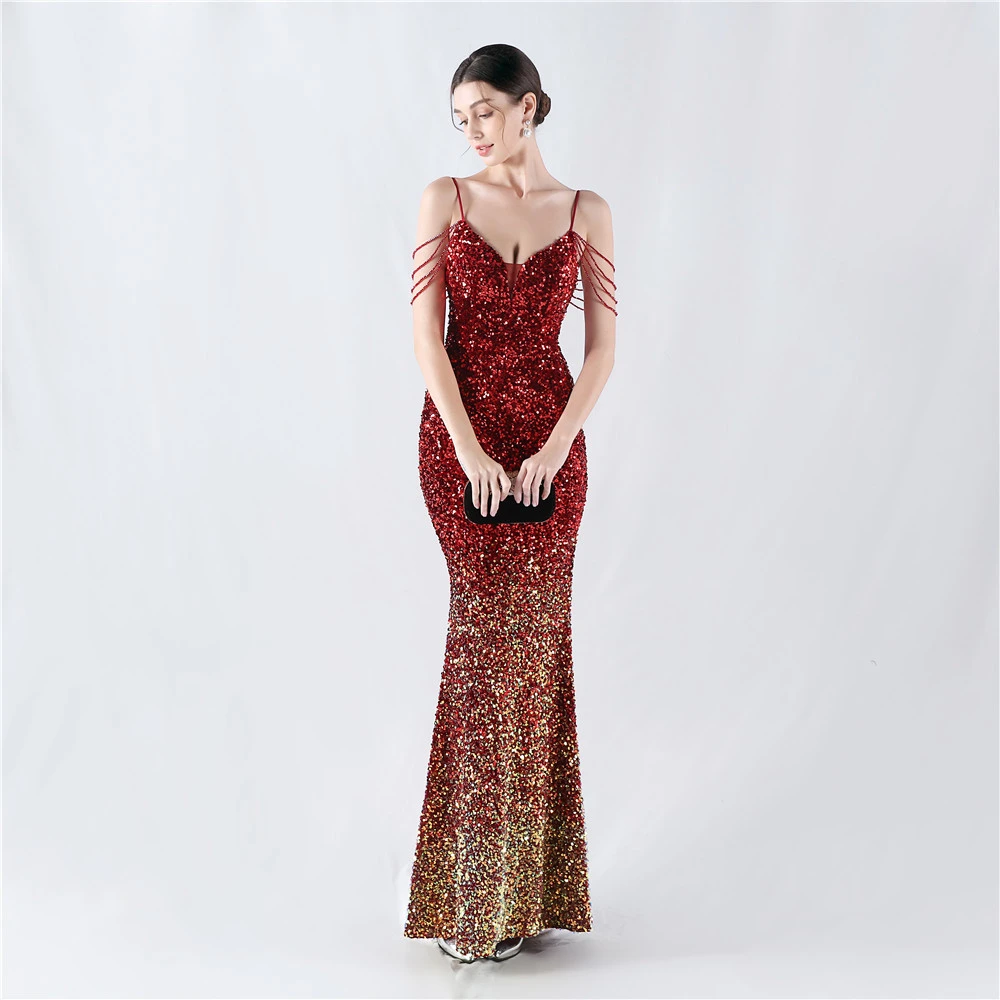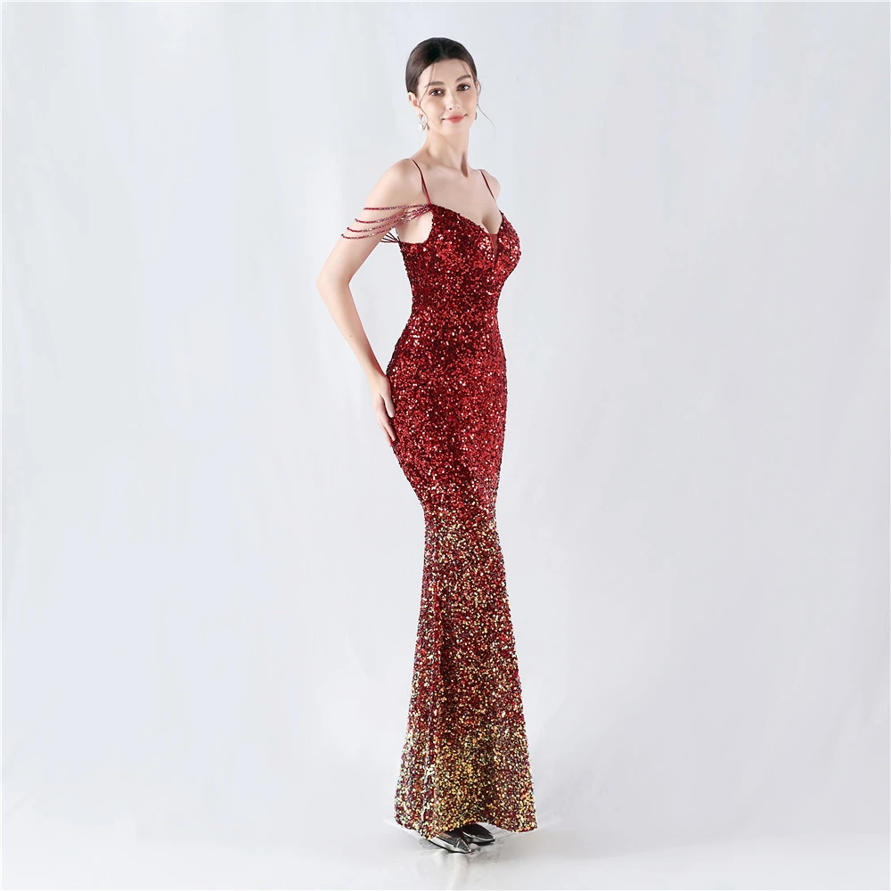 Velvet-Bottom Gradient Sequined Sexy Beaded Suspender Evening Dress