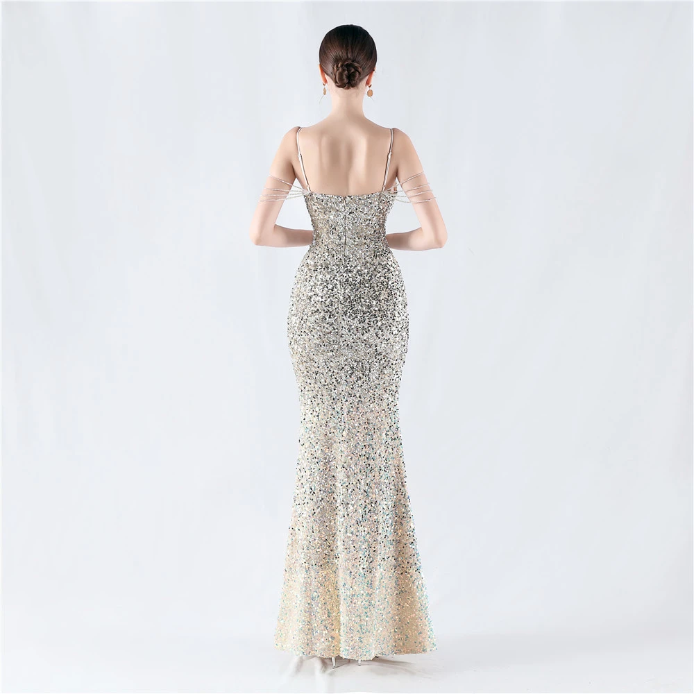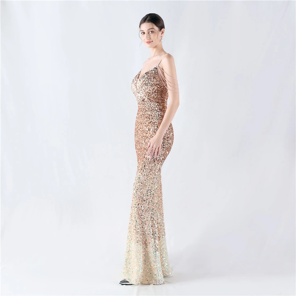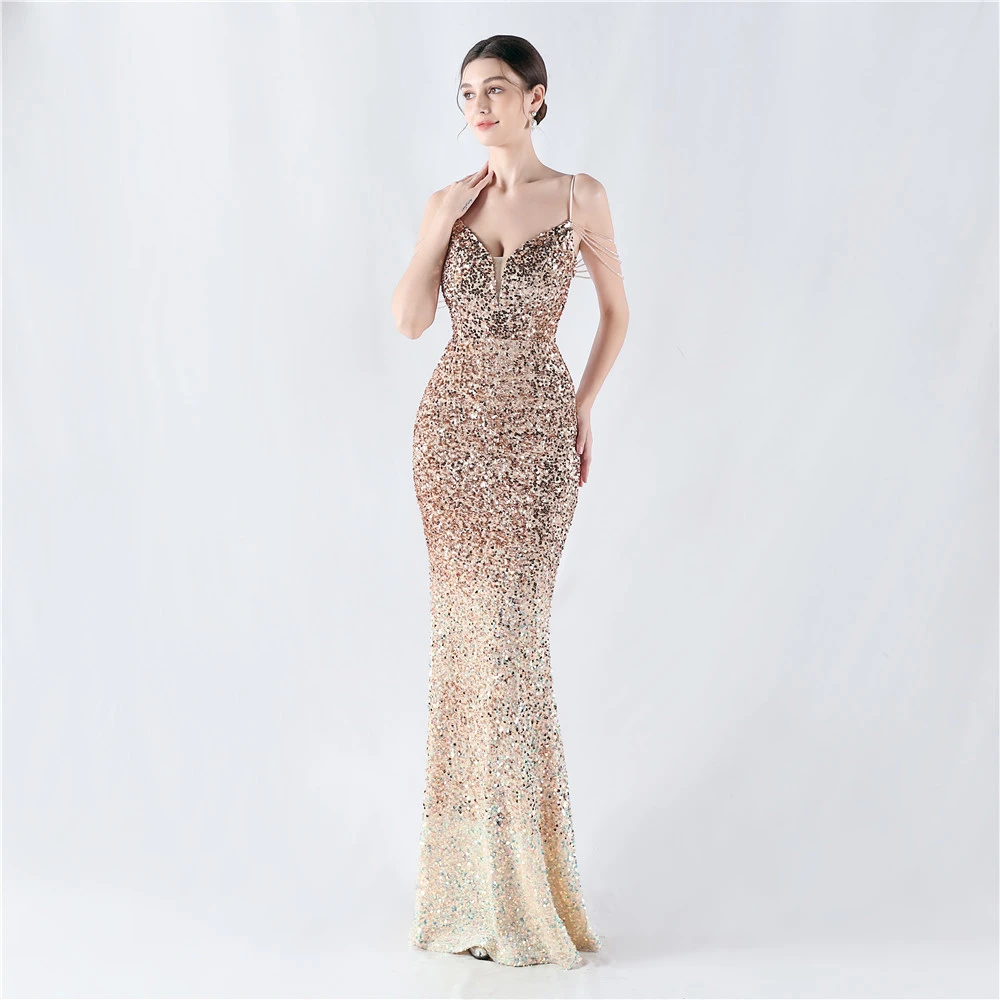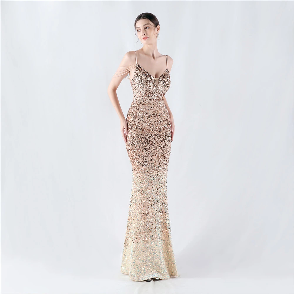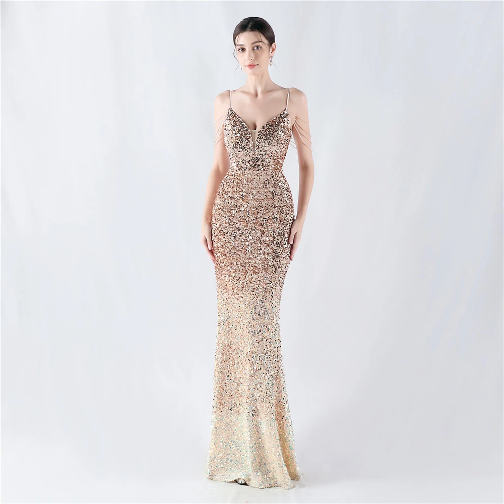 Velvet-Bottom Gradient Sequined Sexy Beaded Suspender Evening Dress