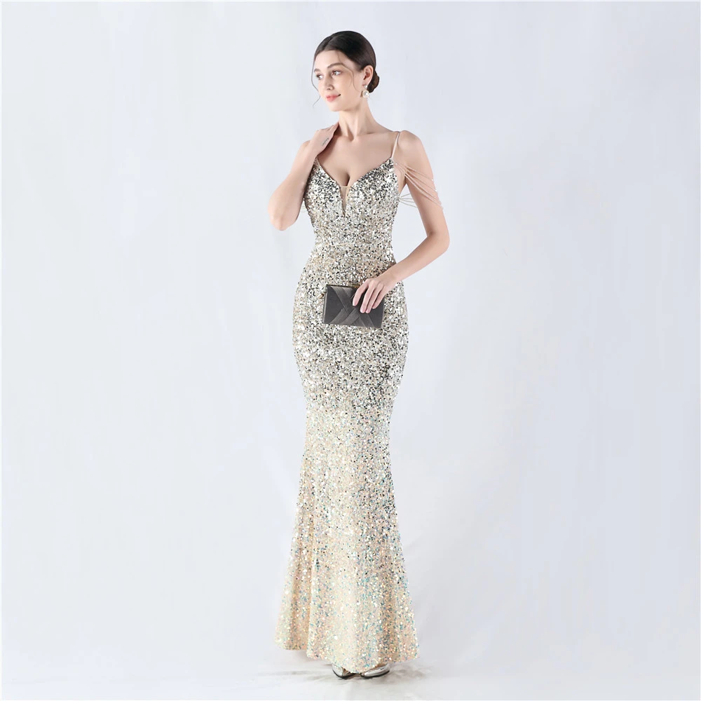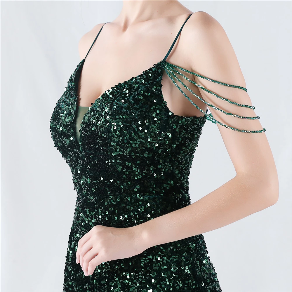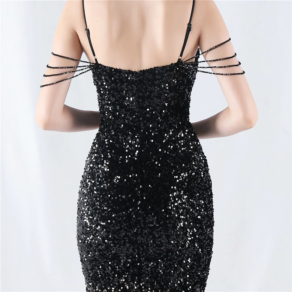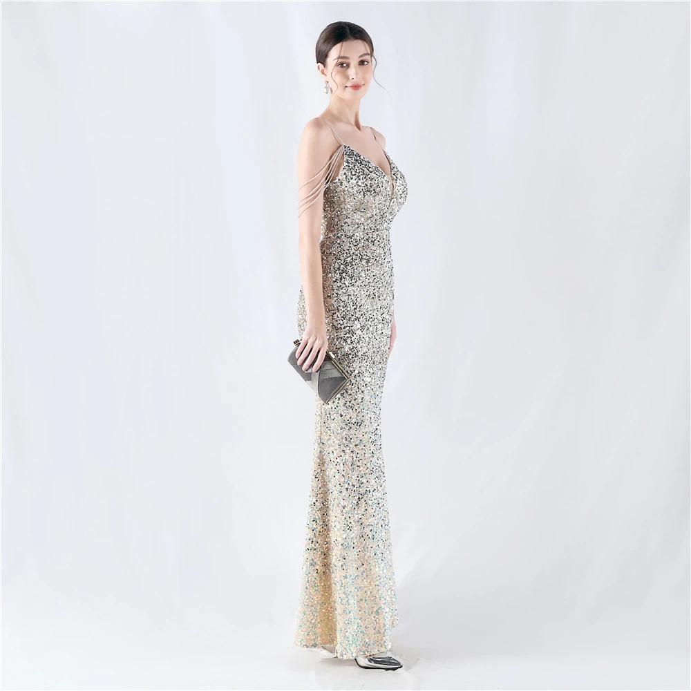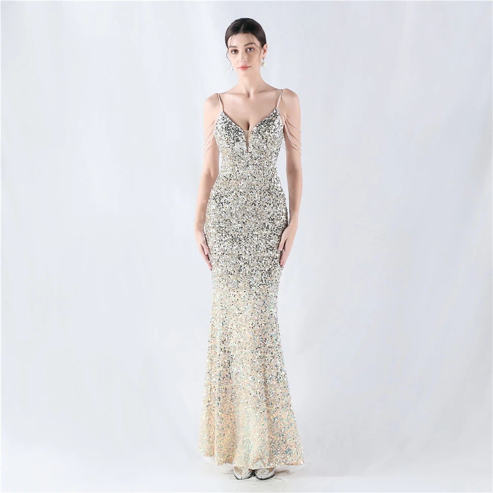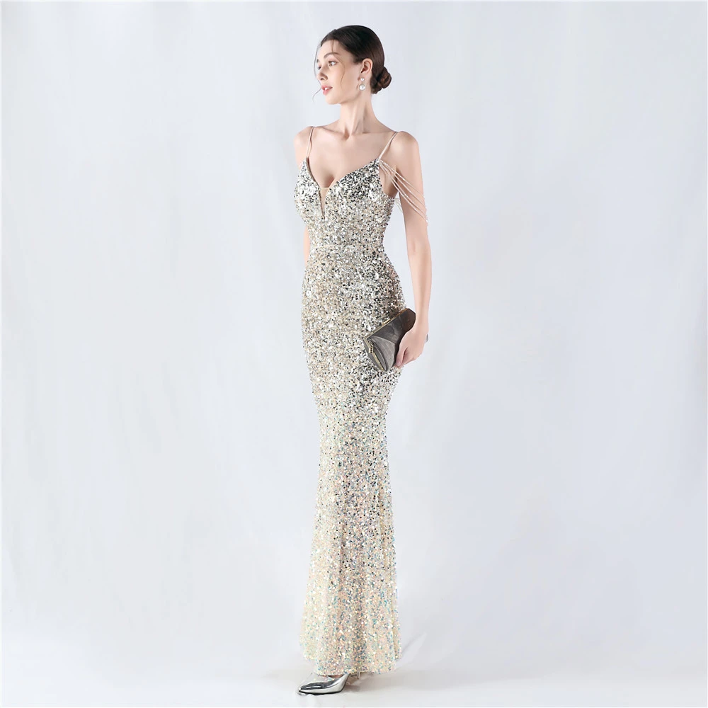 Velvet-Bottom Gradient Sequined Sexy Beaded Suspender Evening Dress