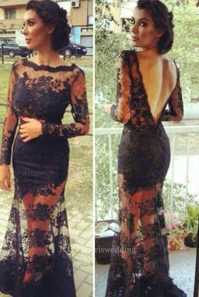 Vestido De Festa Lace Mermaid Prom Dresses Open Back Black Long Sleeves Evening Gowns