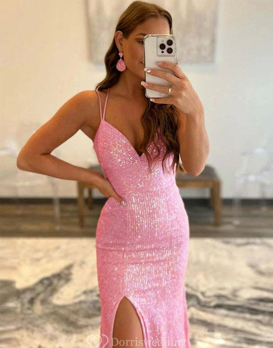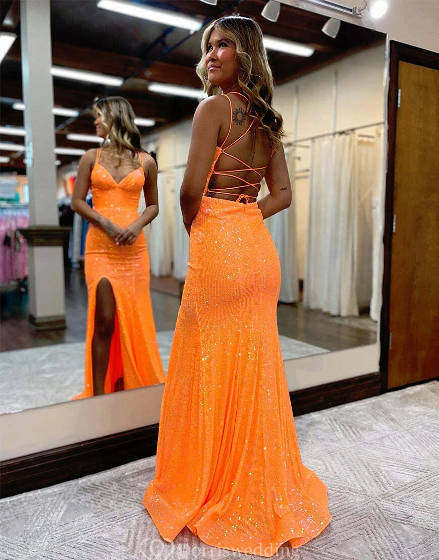 Vibrant Neon-Orange Sequin Gown with Spaghetti Straps & Thigh-High Slit