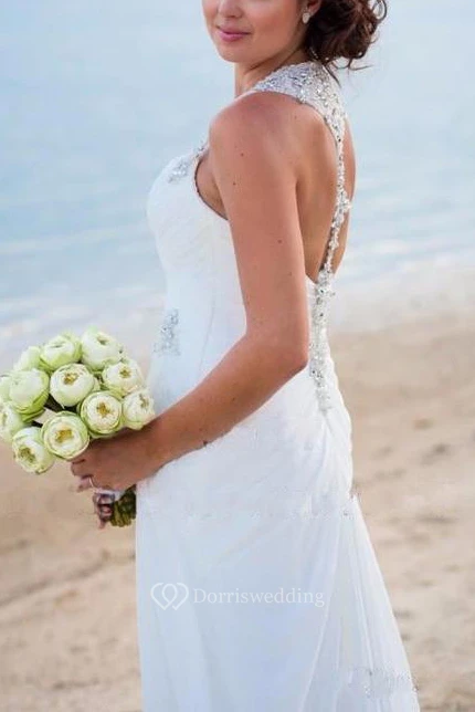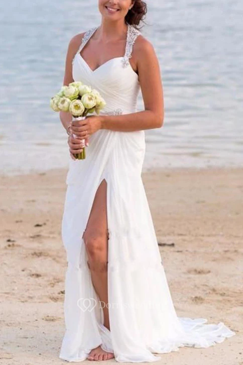 Vintage Beach V Neck Beaded Backless Front Split Sheath Bridal Elegance Gown