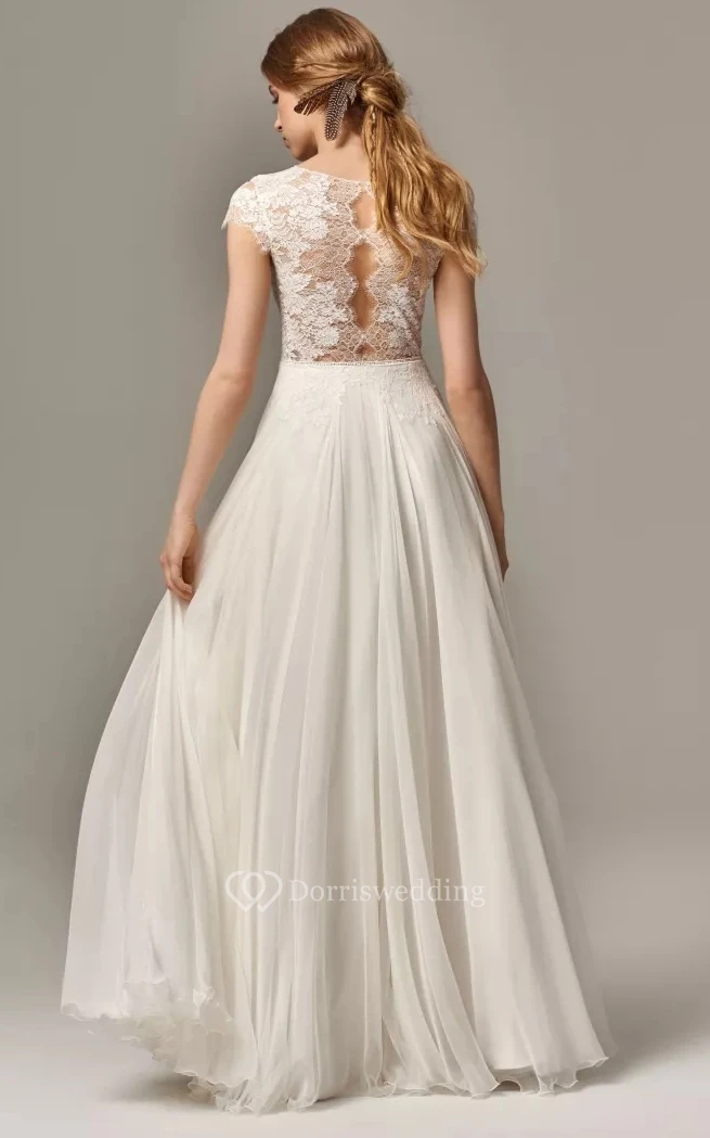 The back of the dress features a single piece of lace. The keyhole cutouts are integrated into the lace design, where the patterned lace gives way to sheer tulle.