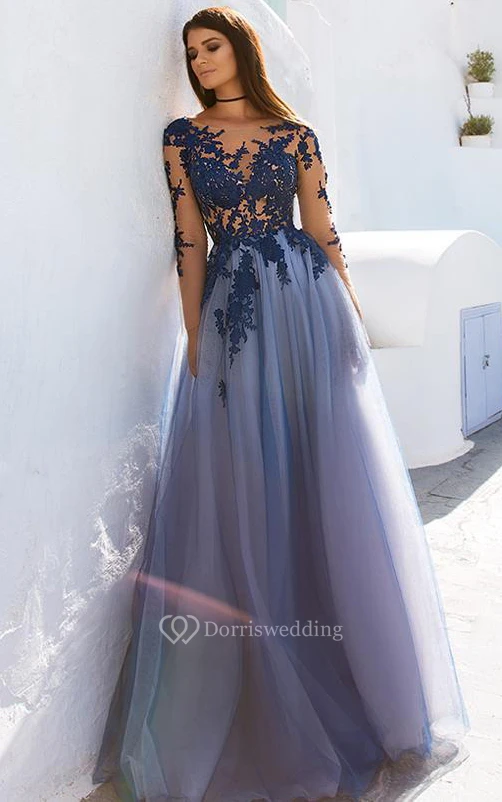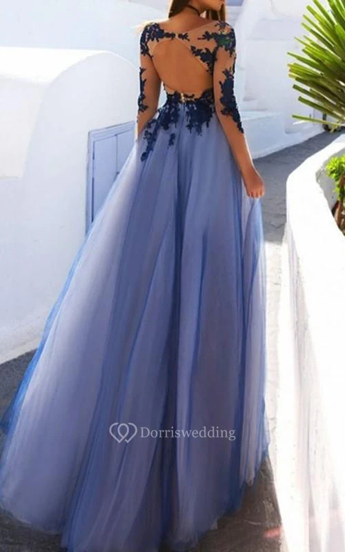 Vintage Lace Tulle A Line Bateau Long Sleeve Prom Dress With Keyhole Appliques
