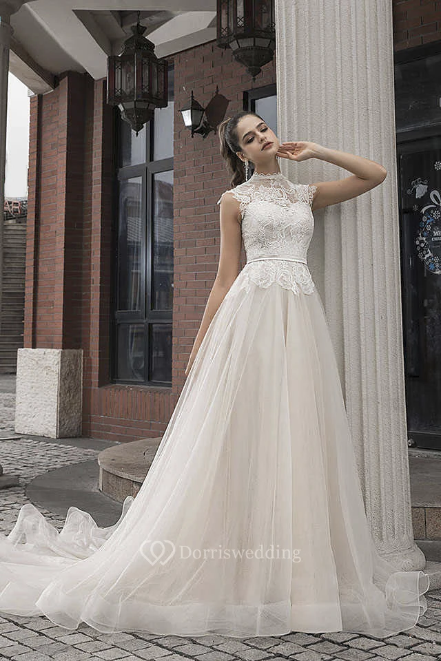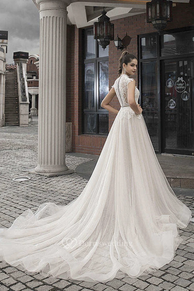 Vintage Lace Tulle High Neck Cap Sleeve Bridal Elegance Gown With Button Back