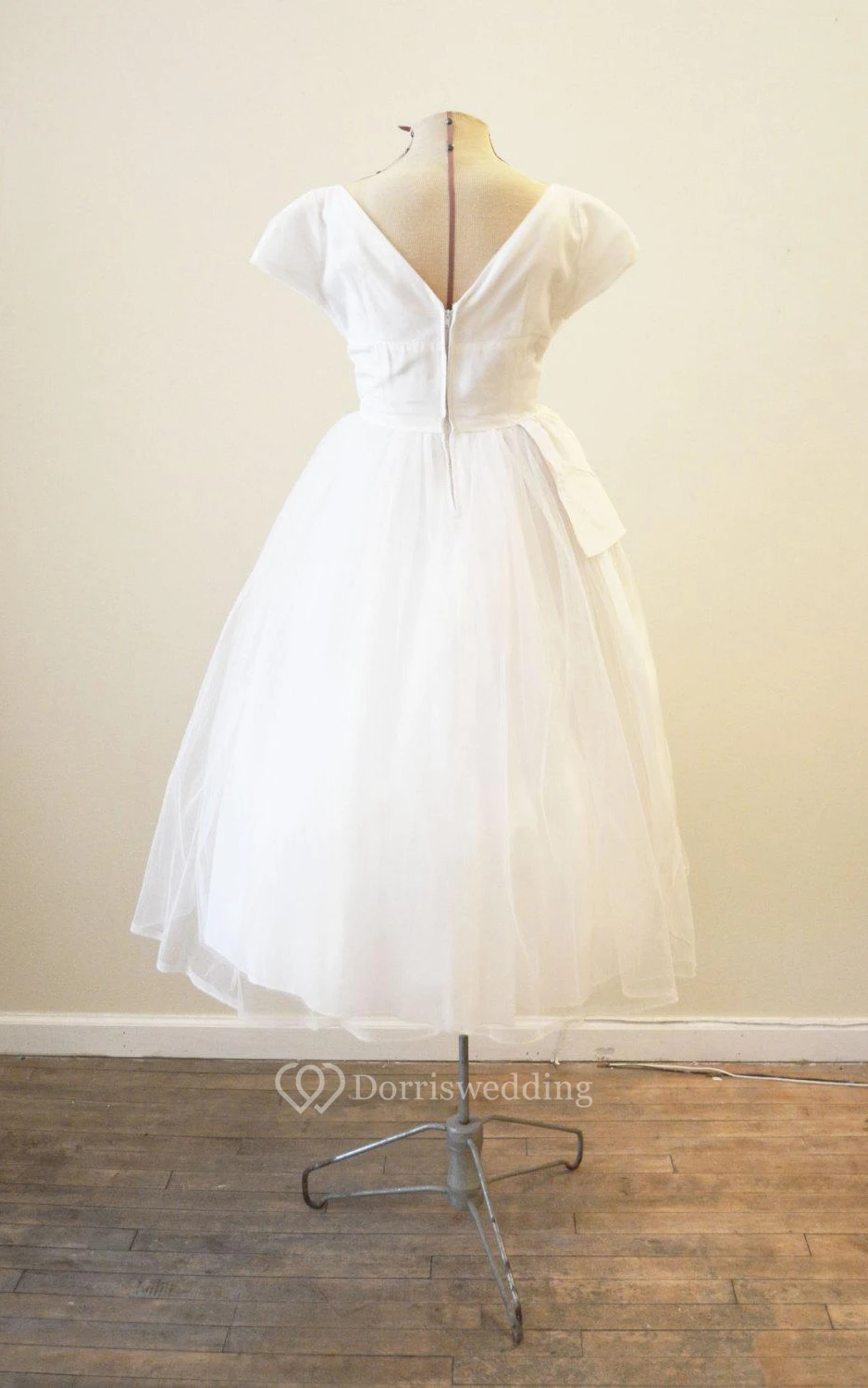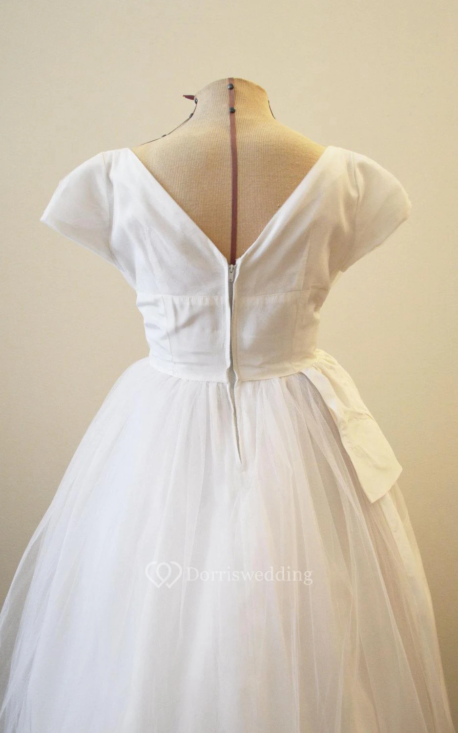 Vintage Tulle Short Sleeve V-Neck A-Line Dress With Pleats