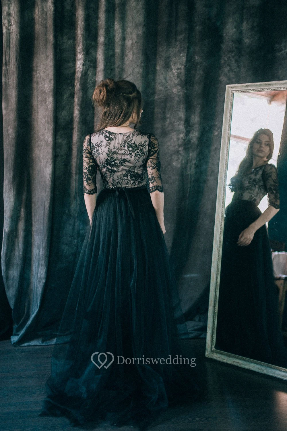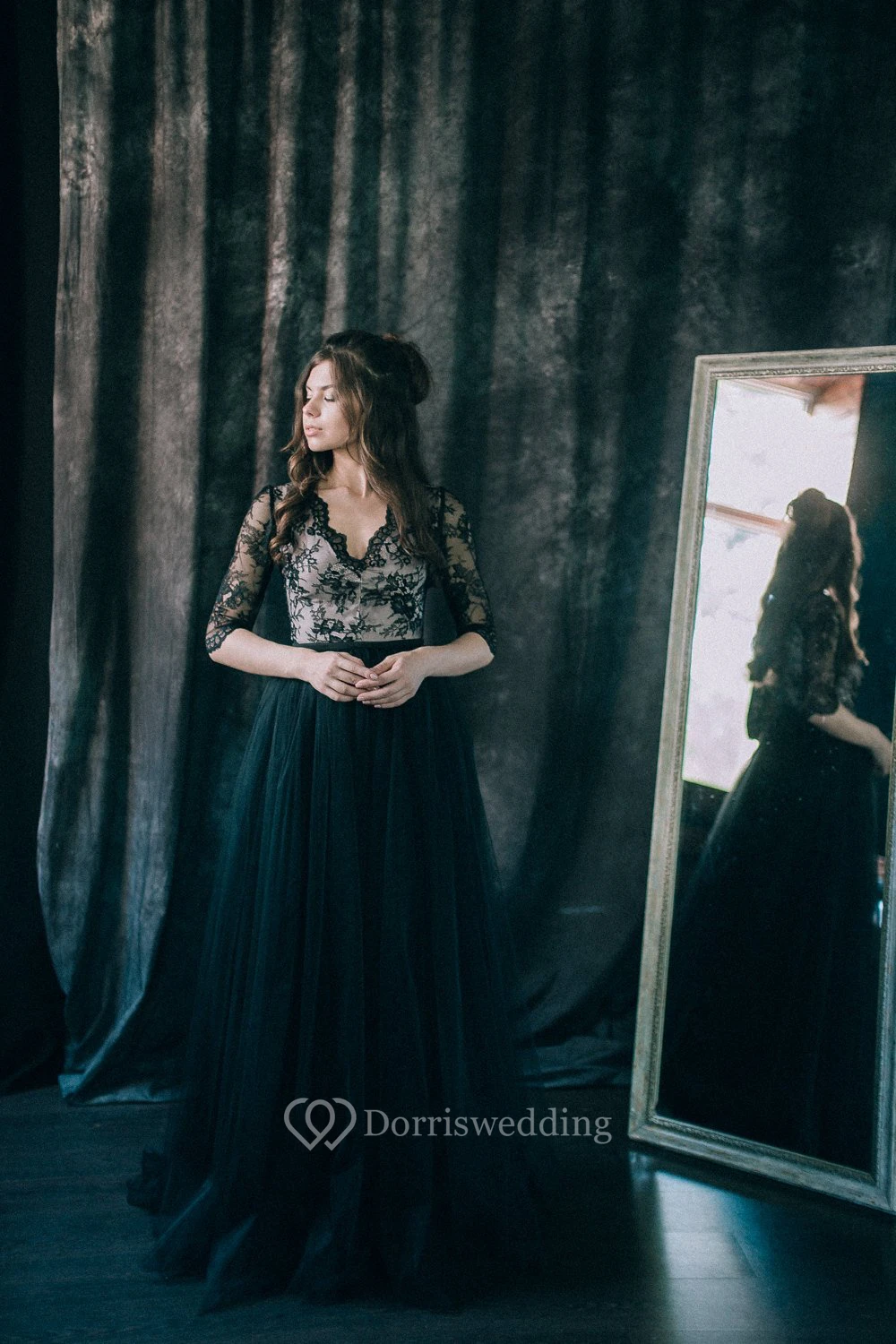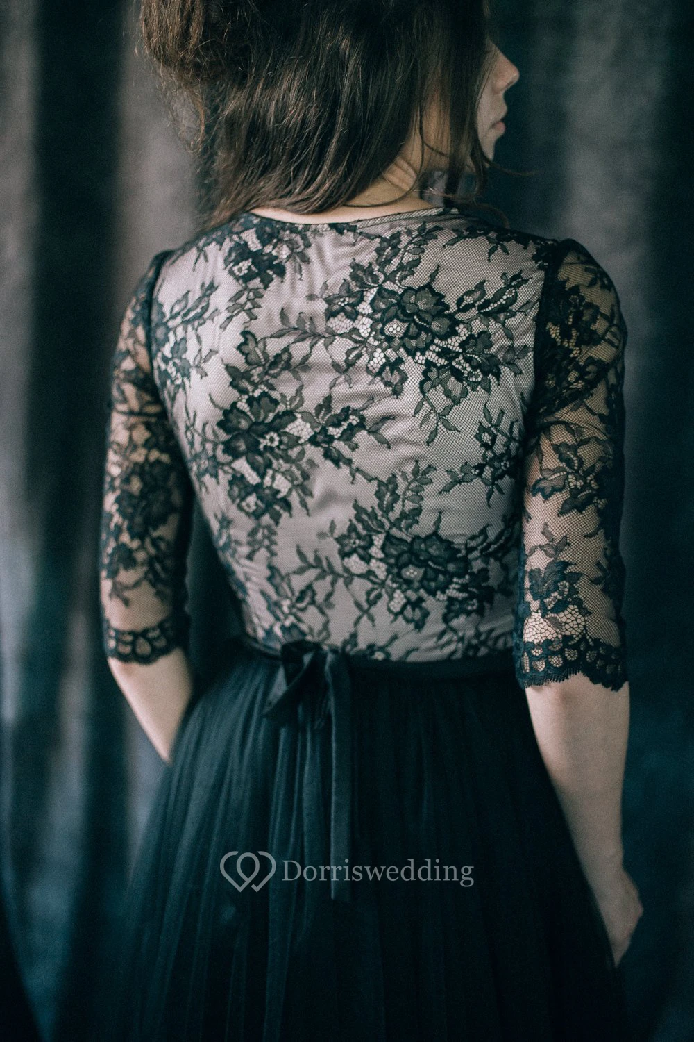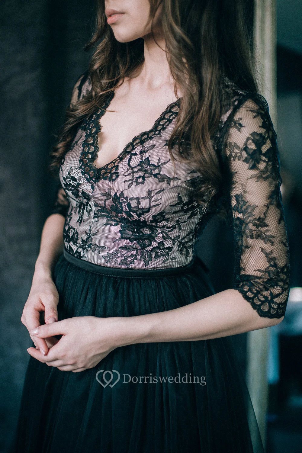 Wedding Dress Sheath Black V-neck Long Sleeve Illusion Low-V Back Lace