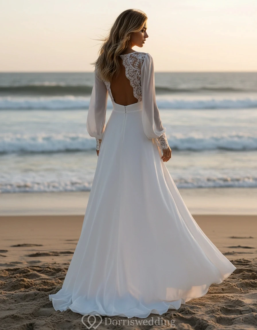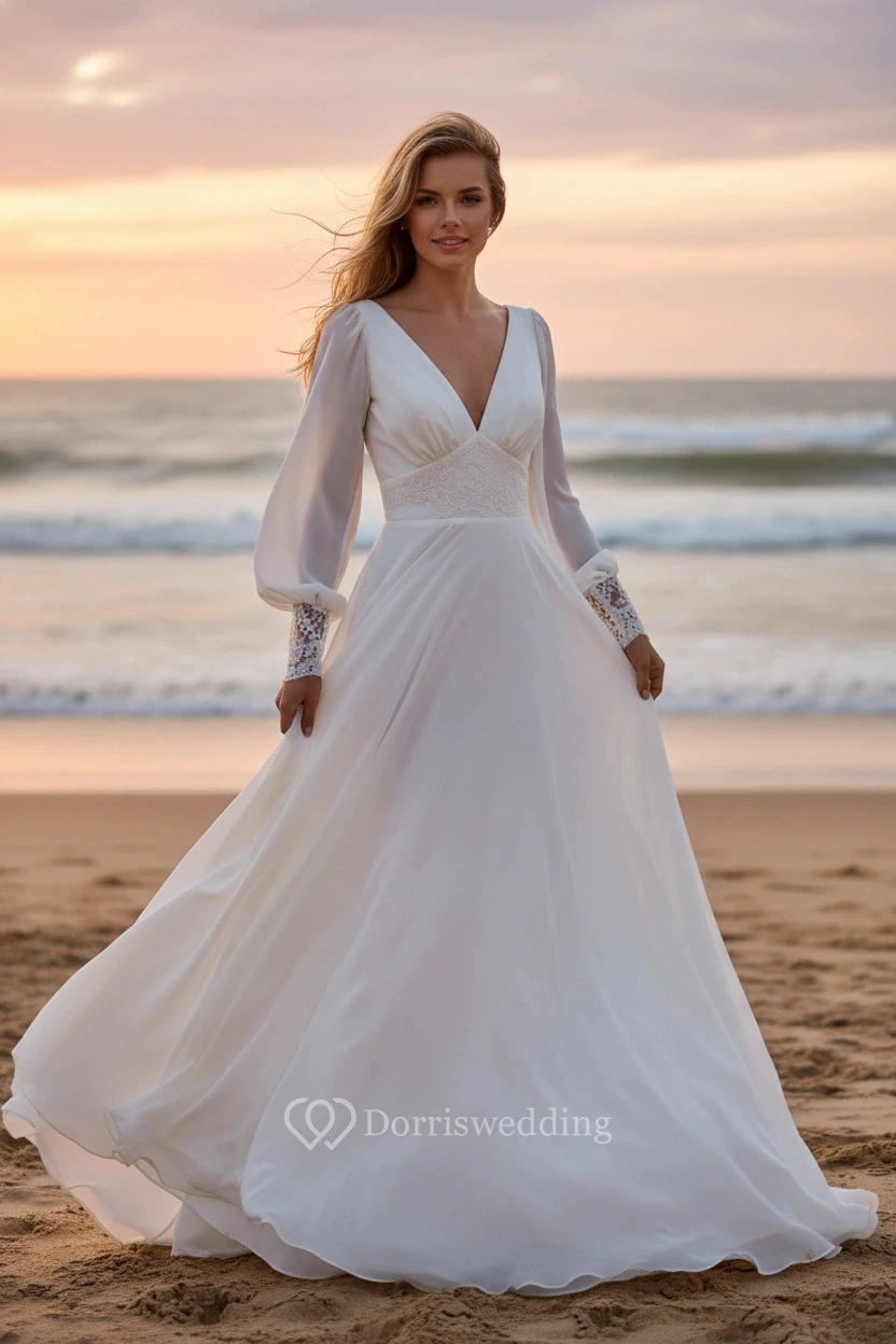 This dress is a work of art. The bishop sleeves are so unique and the lace details are very delicate. The chiffon is very soft and flows beautifully when you walk. It's the perfect dress for a bride who wants something a little different and very romantic.
