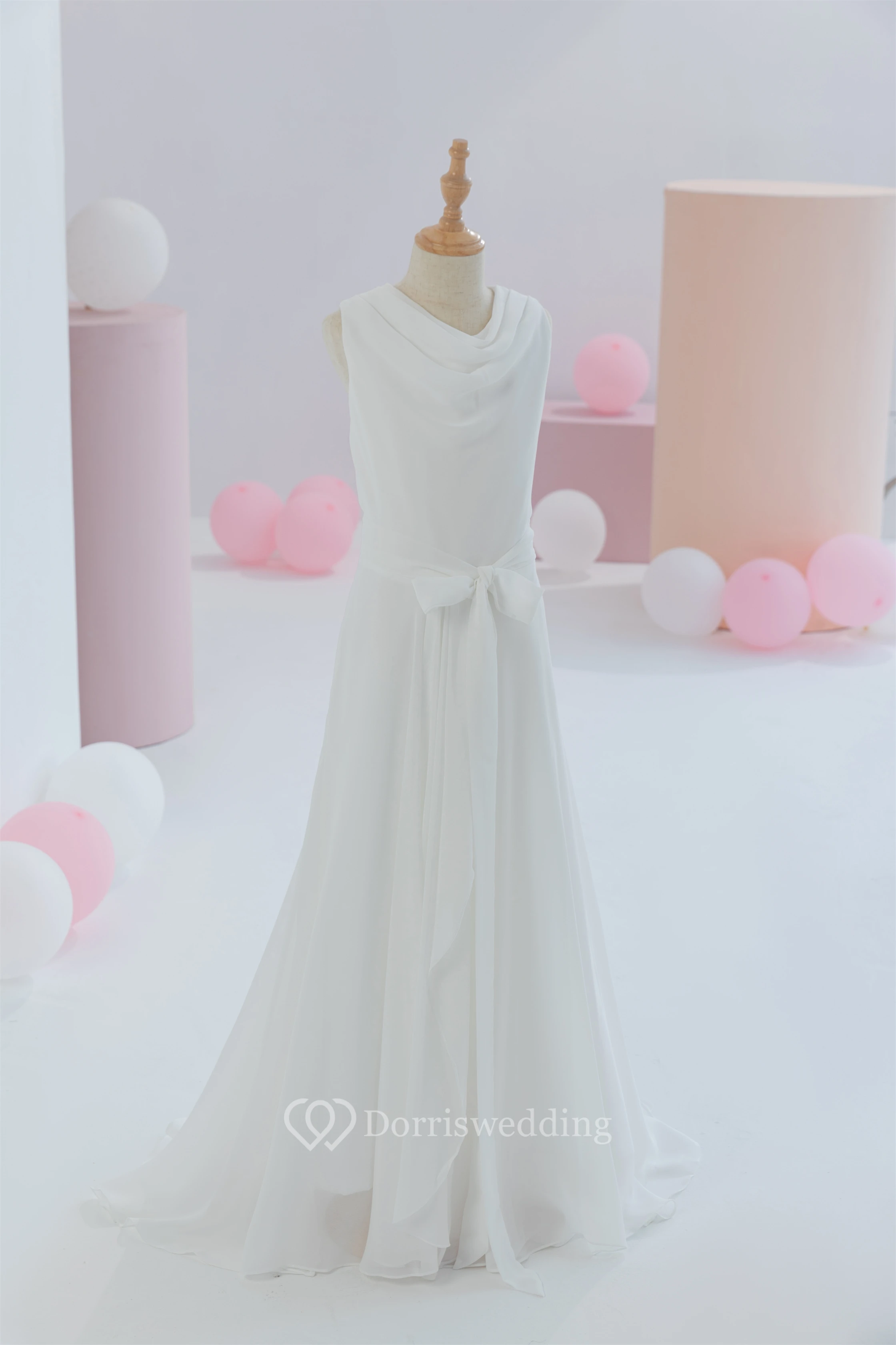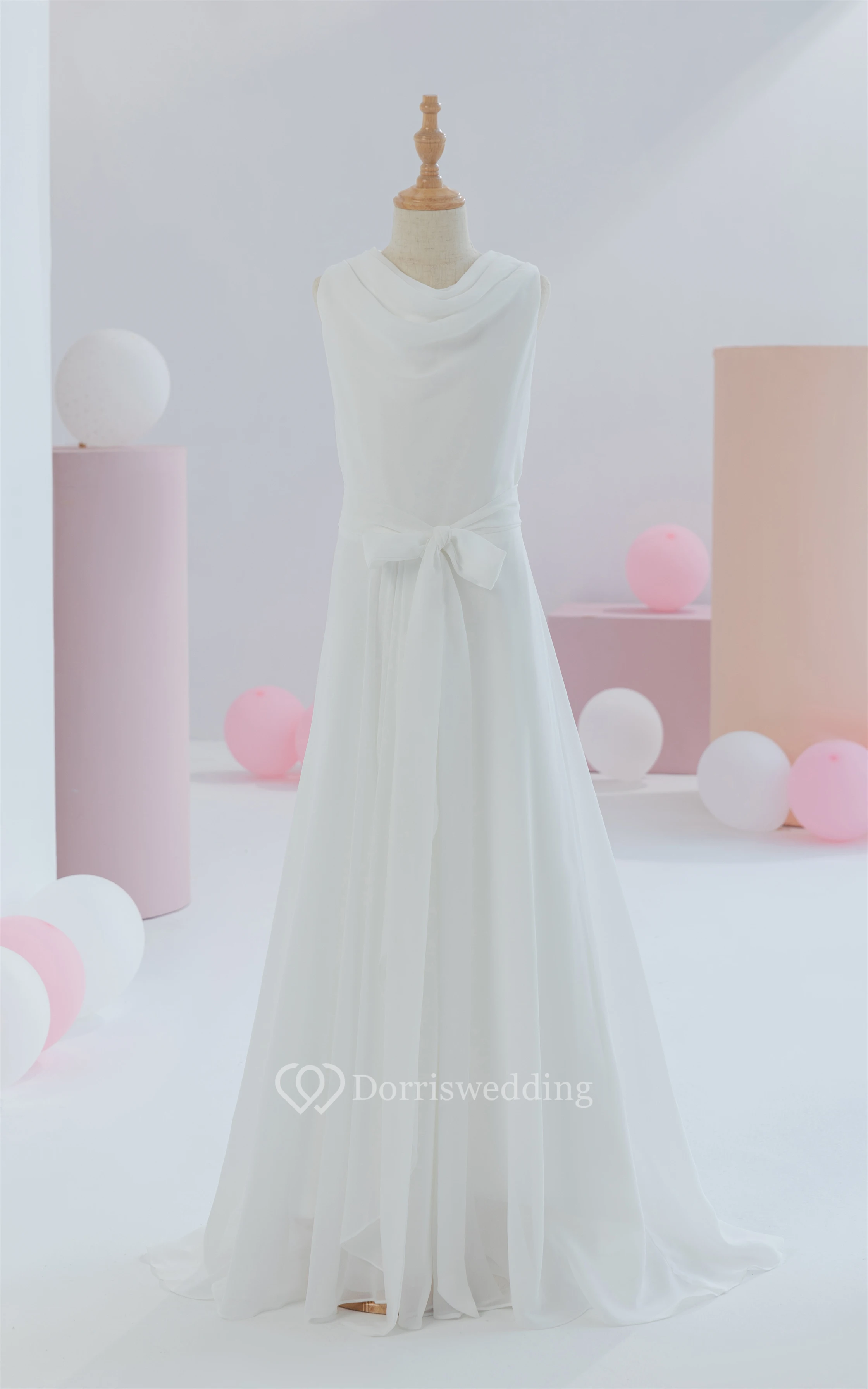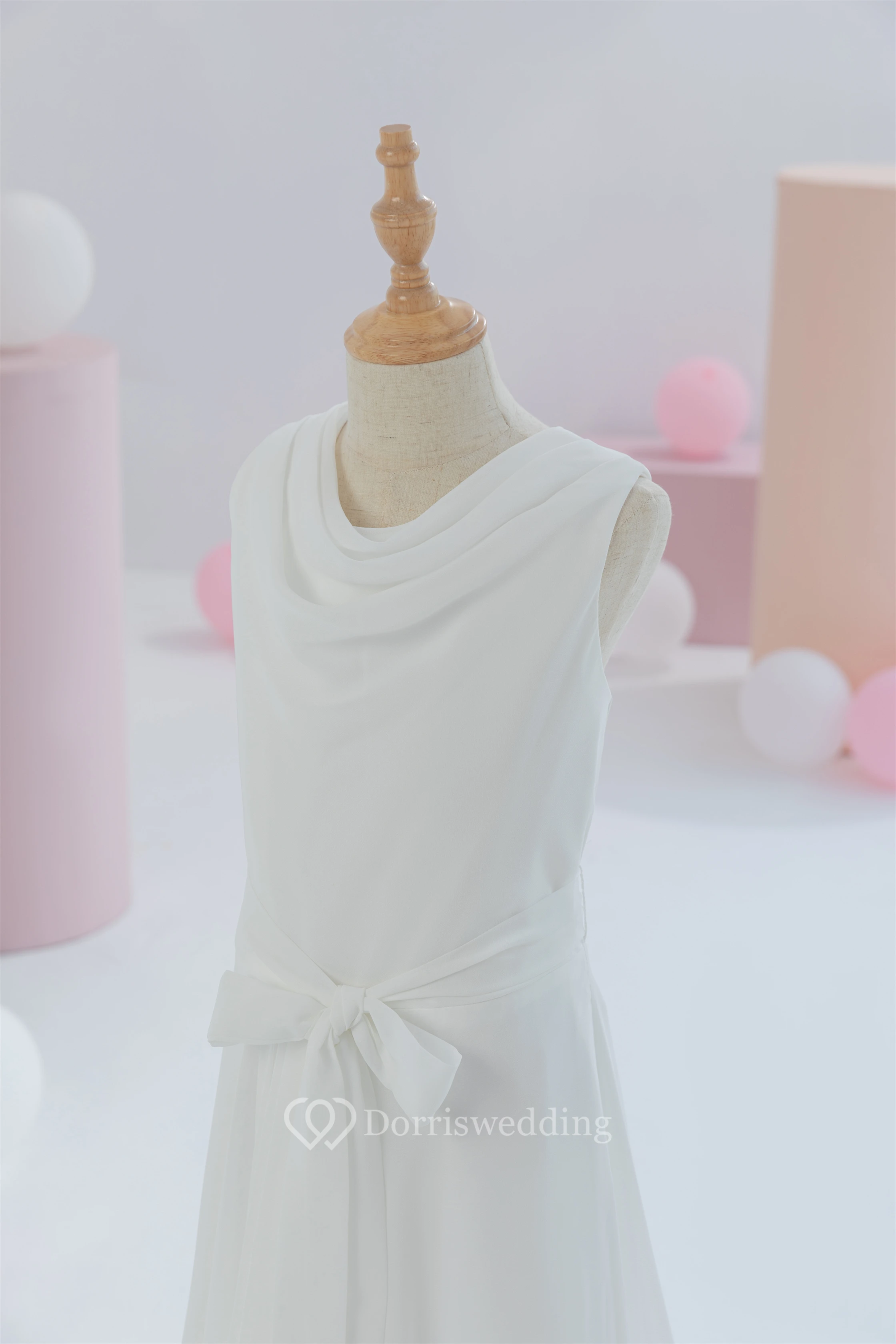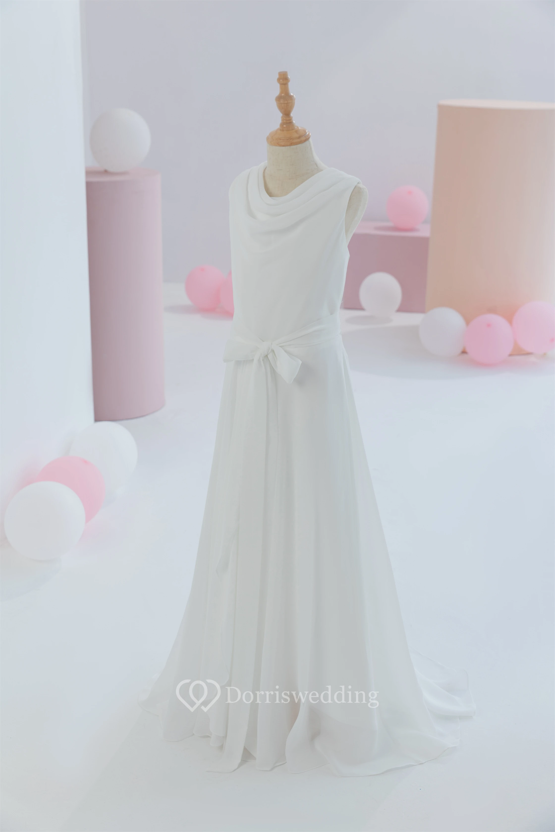 White First Communion Cowl-neck Sleeveless Floor-length Flowergirl Dress