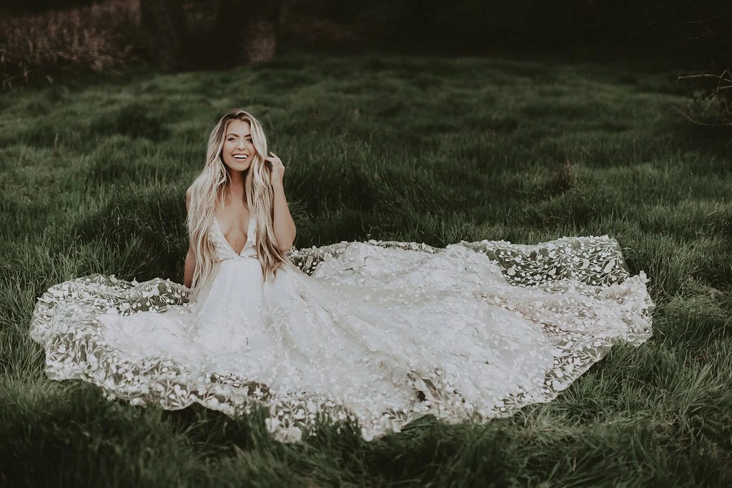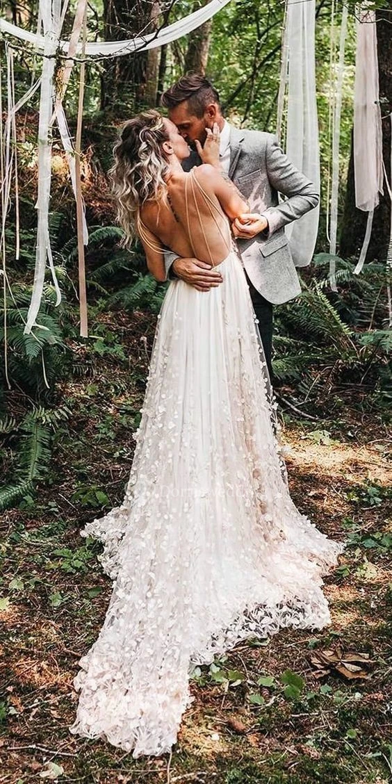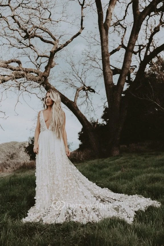This elegant white wedding dress features delicate petal appliques and a sweeping train, creating a romantic outdoor ceremony look. The sleeveless design offers comfort while the full skirt drapes beautifully on grass surfaces. Perfect for garden or outdoor weddings, this dress combines natural elegance with sophisticated detailing. The pure white color contrasts beautifully with green landscapes, making it ideal for spring and summer ceremonies.