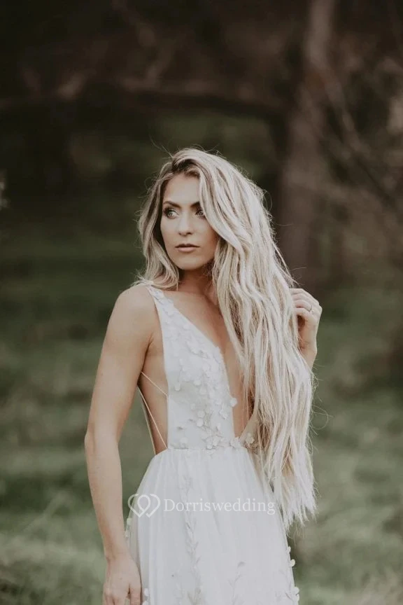 White Floral Applique Wedding Dress with Train