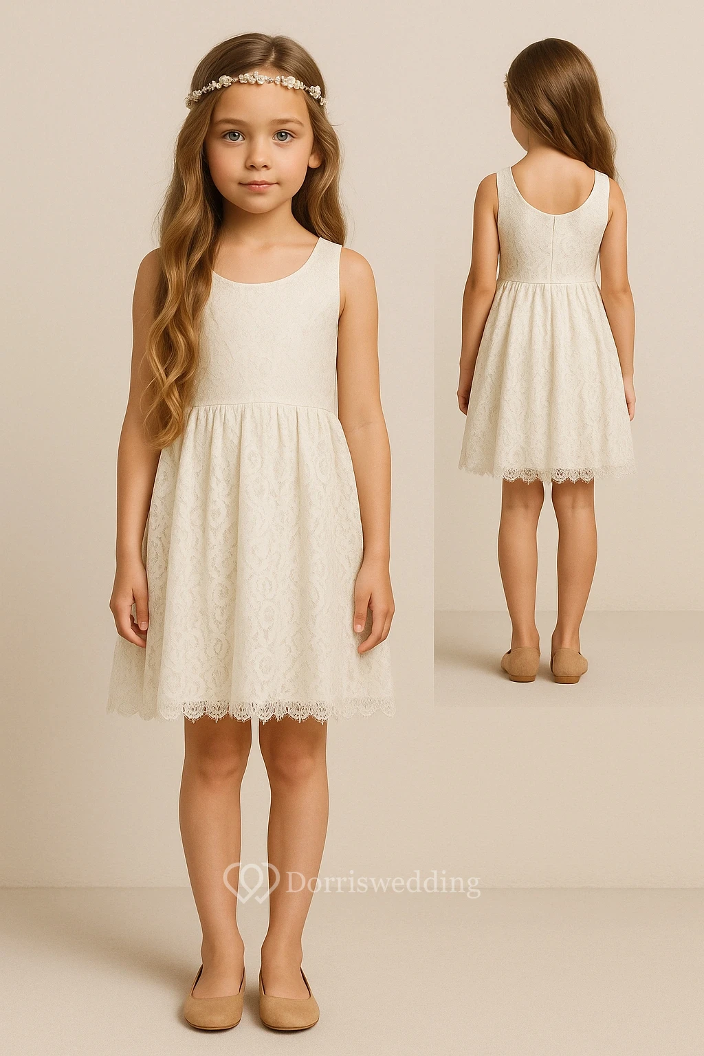 White Lace Sleeveless Scoop-neck Knee-length Flowergirl Dress