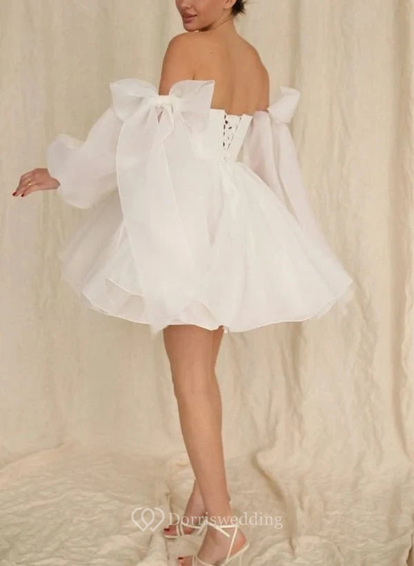 This charming white short dress features an off-the-shoulder design with a puff bow accent and a tea-length A-line skirt made of lightweight tulle. Perfect for casual weddings, parties, or receptions, it offers a sweet and playful look. The design is comfortable and stylish for warm weather occasions.