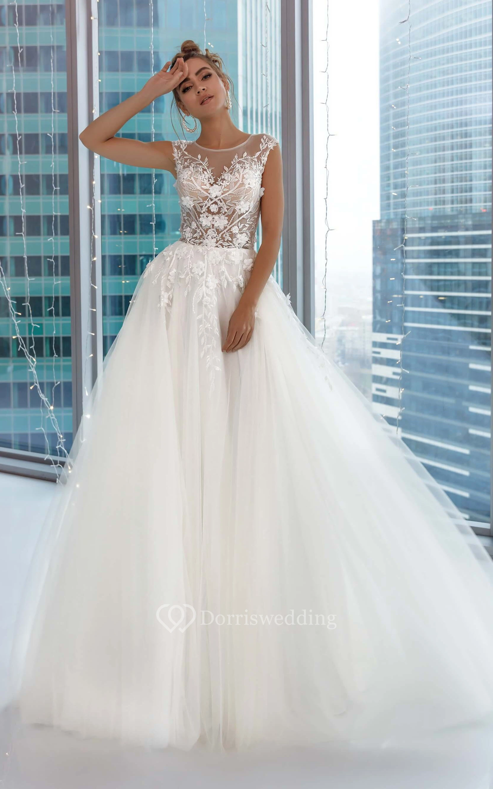 White Scoop-neck Cap Tulle Ball Gown Applique Prom Dress with Illusion Back