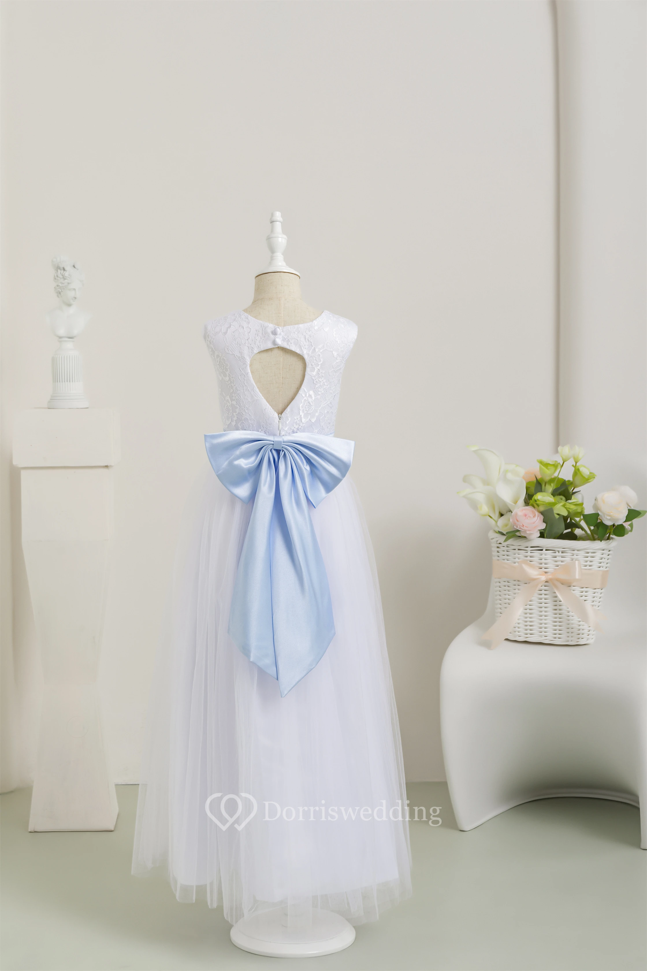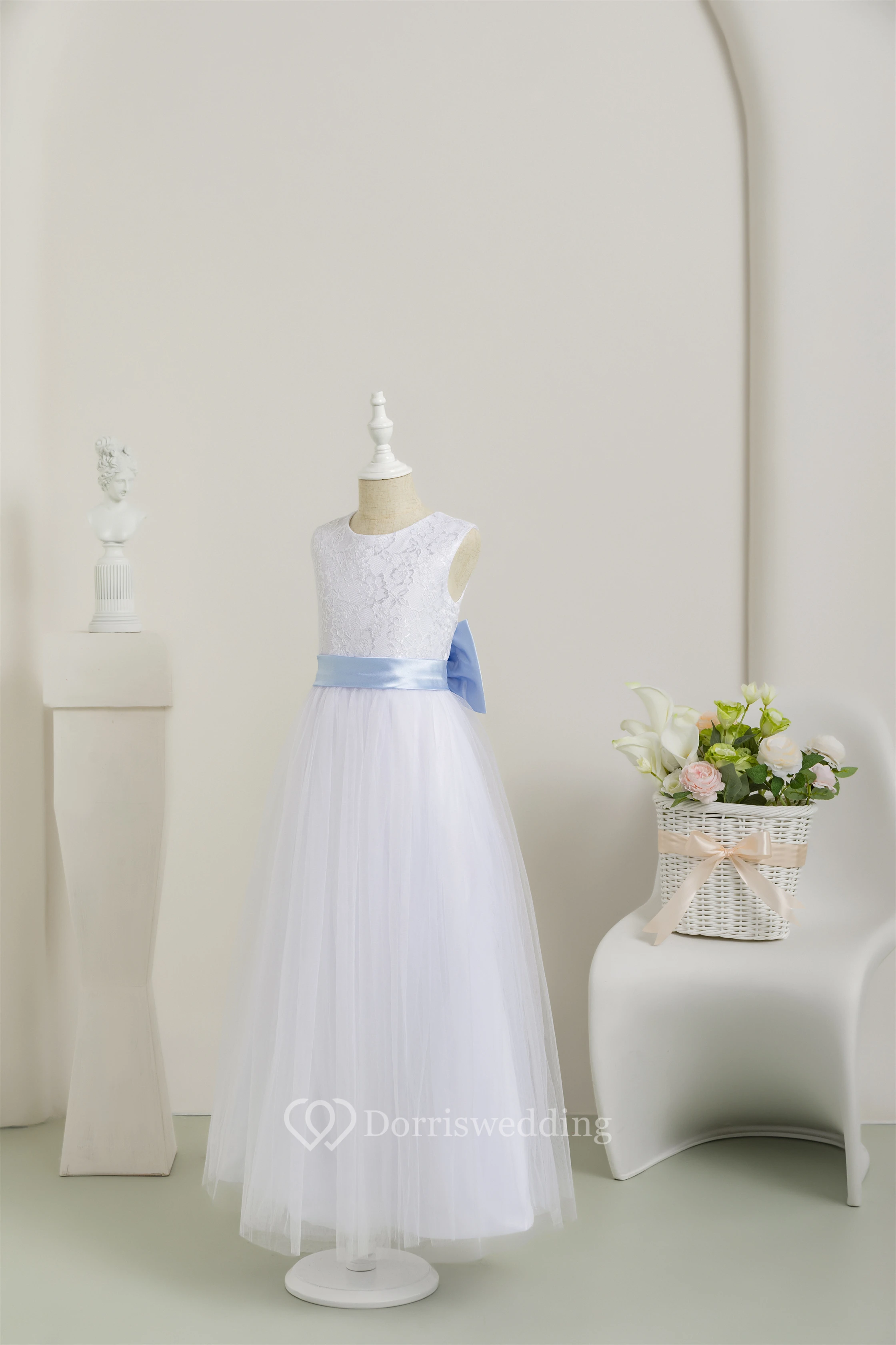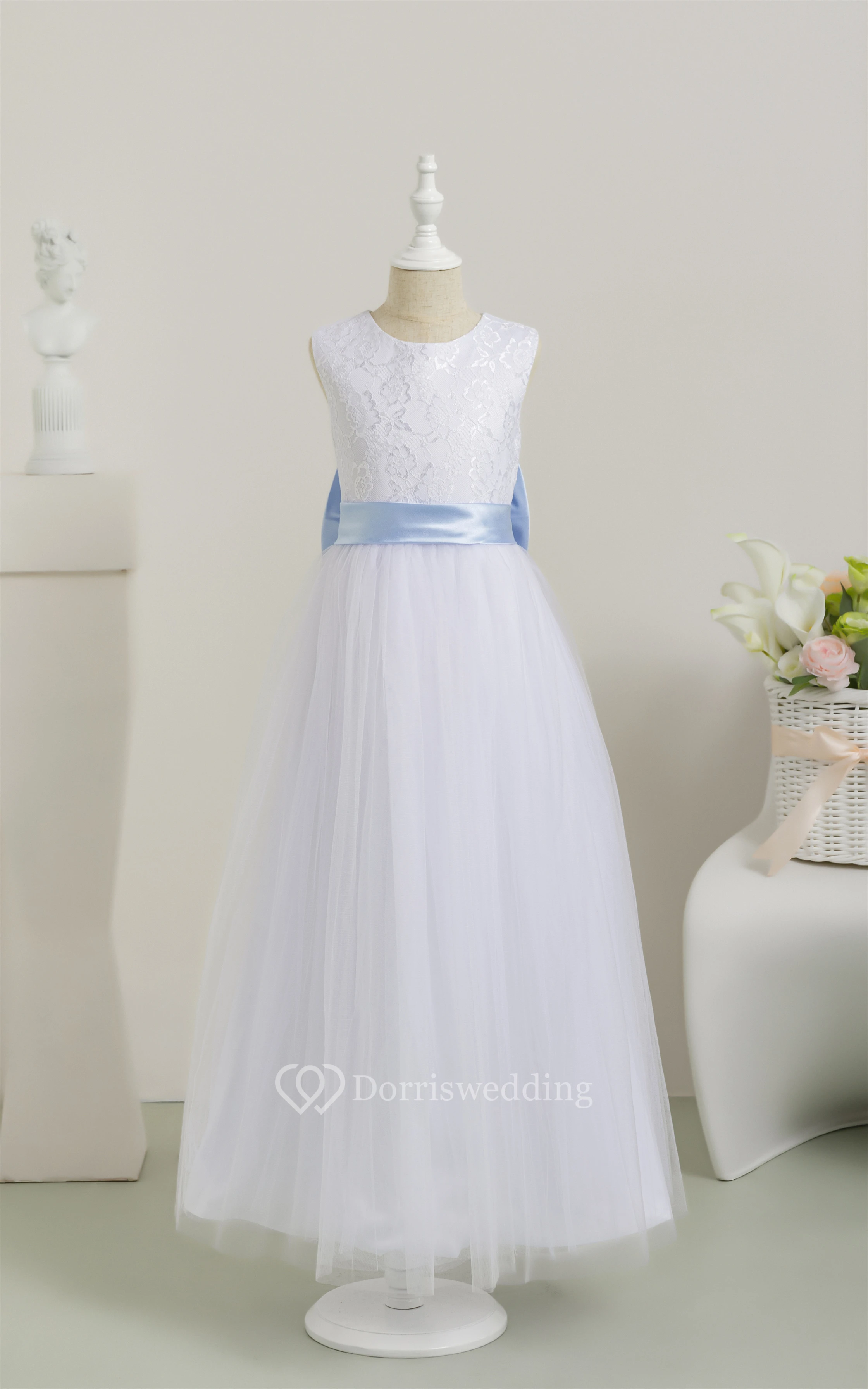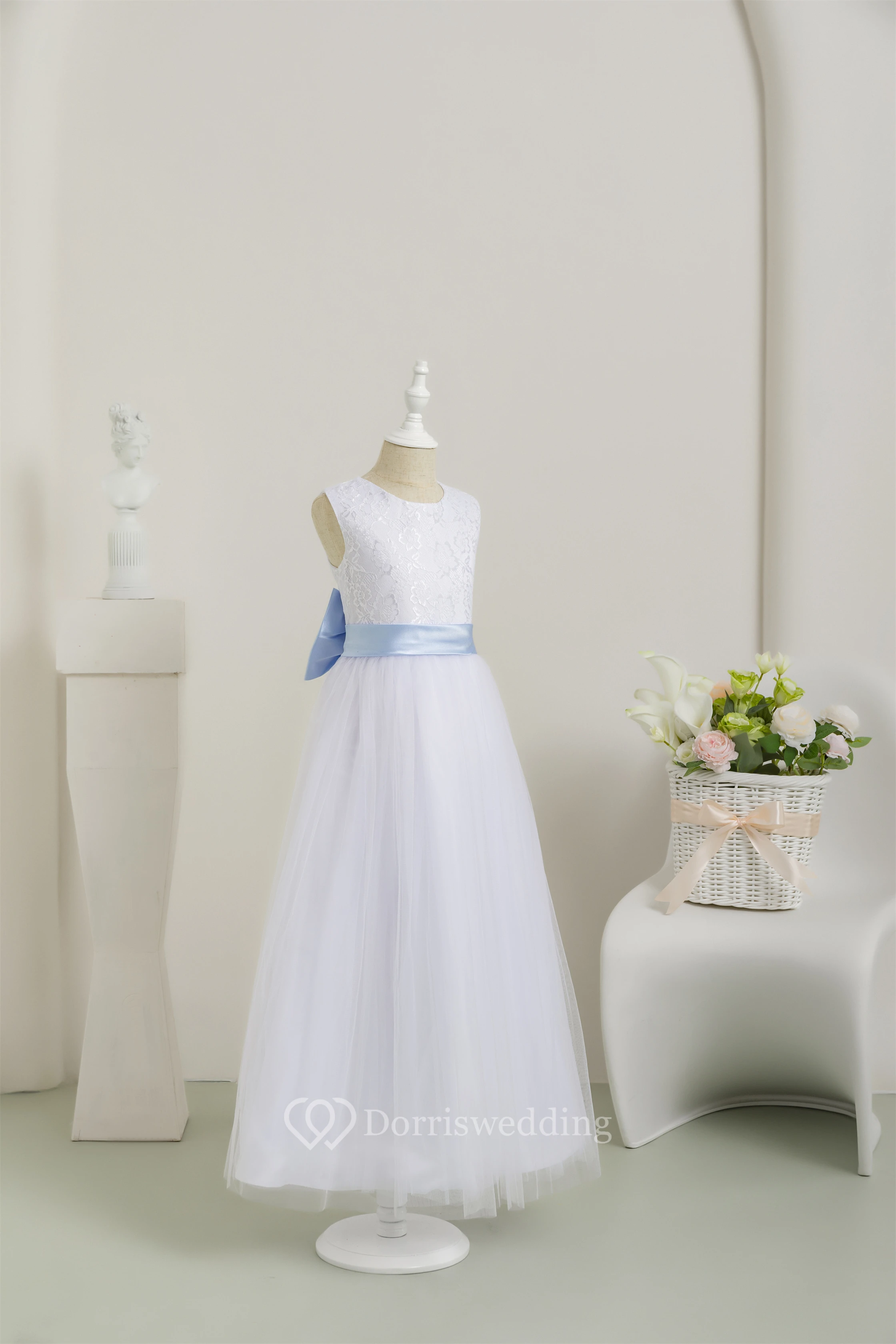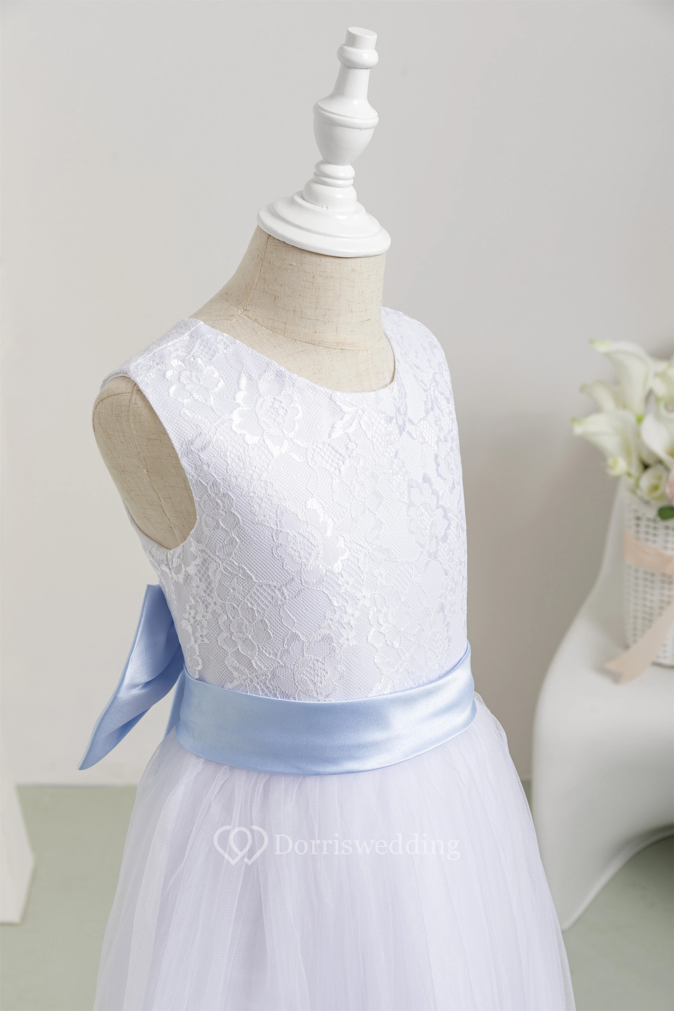 White Scoop Sleeveless Tulle A-line Communion Dress with Back Bow