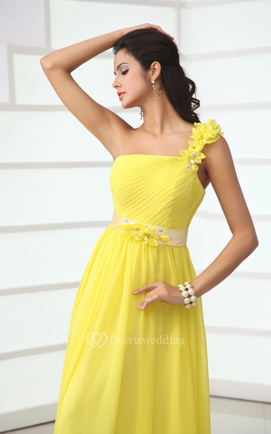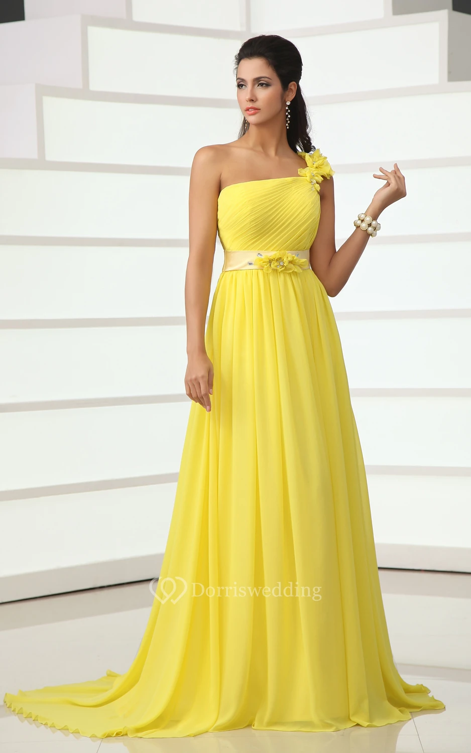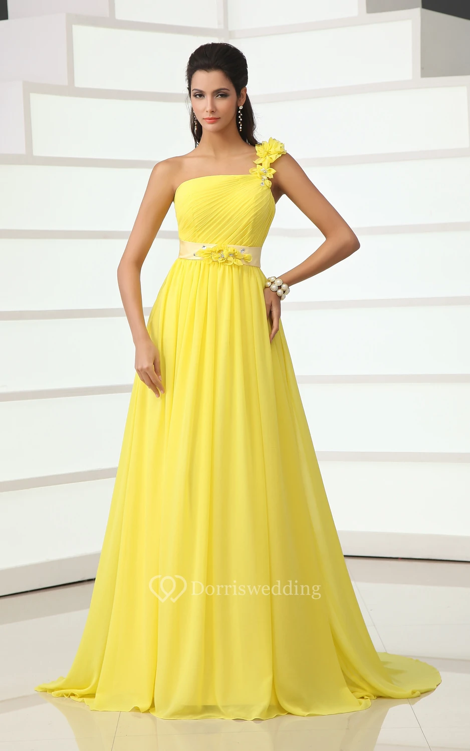 Wonderful Floral One-Shoulder A-Line Chiffon Gown Has Floral Sash